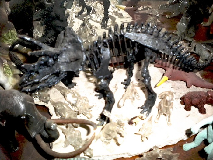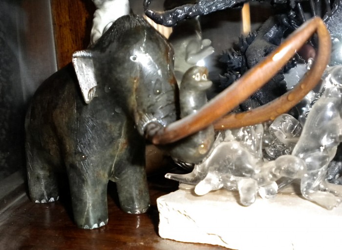 Ceramic Tyrannosaurus (probably 1950s or 1960s vintage) metal Triceratops skeleton sculpted by Larry Williams, a mammoth Mammoth carved by Glenn Tingook (mid-1980s), with tusks made from real mammoth fossil ivory, and other prehistoric items.