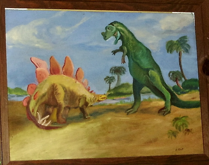 I did this oil painting of Stegosaurus vs. Ceratosaurus around the 6th grade. It was copied from a (much better!) Charles R. Knight painting (below) published in the February, 1942 issue of National Geographic Magazine, a copy of which is also in my collection).