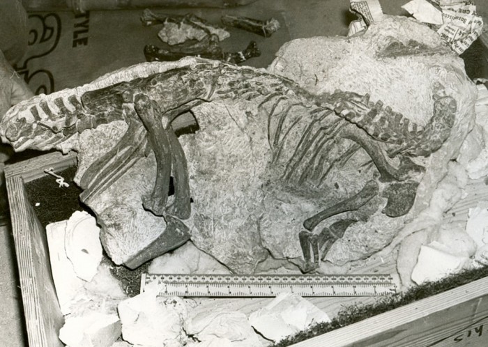 Skeleton (cast, below) of the dinosaur Othnielia rex, from Valley Anatomical Preparations, Canoga Park, CA. Also, the original skeleton (bottom of page, photo by paleontologists Robert A. Long and Samuel P. Welles), in the collections of the Brigham Young University Vertebrate Paleontology Department, lacks a skull.