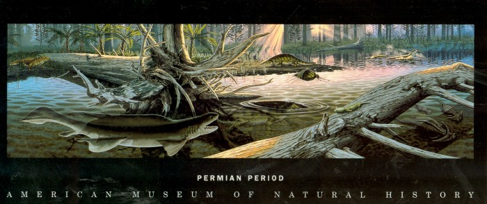 Souvenir postcard (one of a set) from the American Museum of Natural History, New York City, reproducing Robert Butler’s (1996) painting of life during the Permian period.