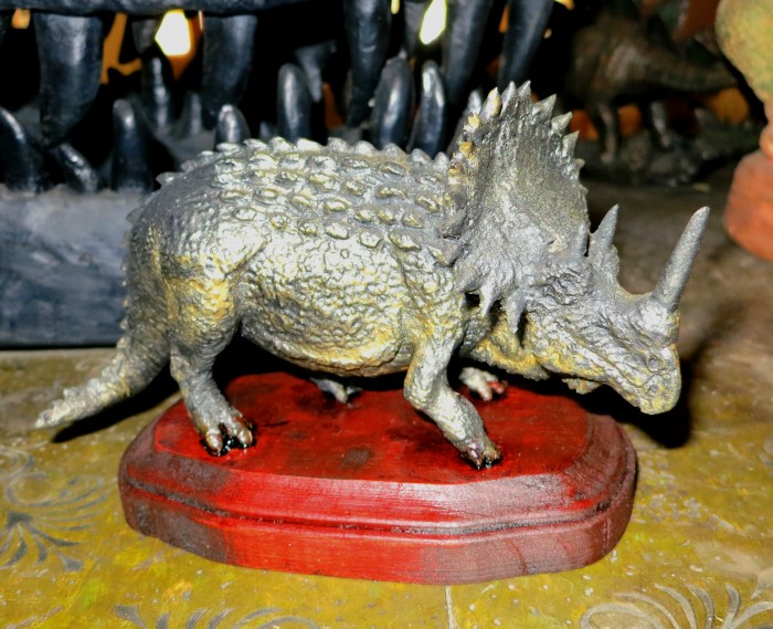 Allen A. Debus sculpted this sculpture of the way the putative horned dinosaur Agathaumas sylvestris was believed to have looked back in the late 19th Century, based upon a vintage sculpture and subsequent painting by artist Charles R. Knight. Actually, “Agathaumas” was a “headless wonder” based on scrappy fossil material probably pertaining to the well-known ceratopsian dinosaur Triceratops.