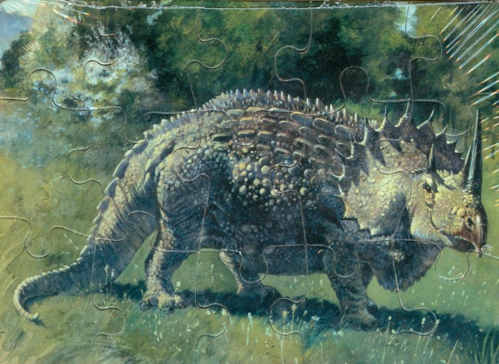 Knight’s painting of Agathaumas, done in1895 under the direction of paleontologist Edward Drinker Cope, reproduced in this “jigsaw puzzle” souvenir postcard from the American Museum of Natural History, manufactured by Whitehall Games, Inc., of Newton, MA; and a “Dinosaur Series” trading card from Nu-Cards (1961).