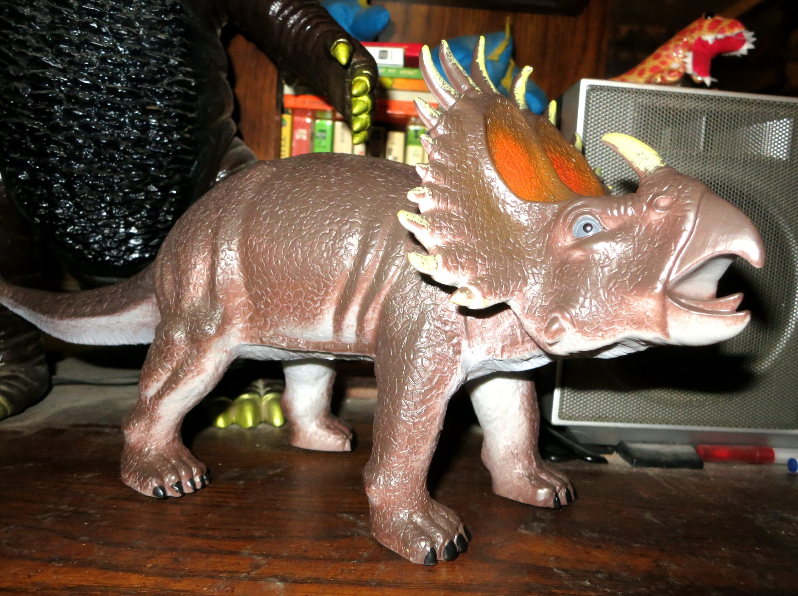 A rubber ceratopsian dinosaur seemingly modeled in part after Knight’s Agathaumas painting and sculpture, from Creatoloy in Irving, Texas, but made in China.