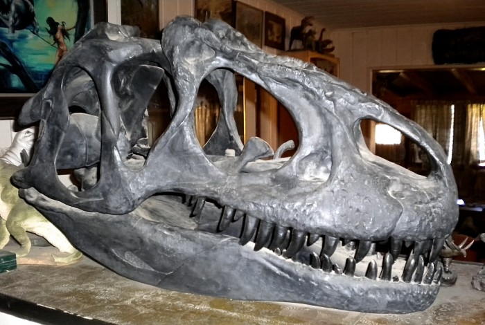 Cast of the reconstructed skull of Allosaurus fragilis — the largest yet collected, from the Cleveland-Lloyd Dinosaur Quarry, Utah — from paleontologist James H. Madsen, Jr.’s DINOLAB, Salt Lake City.