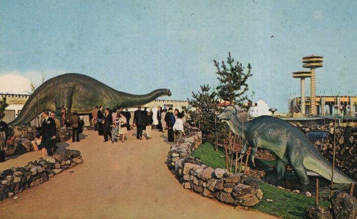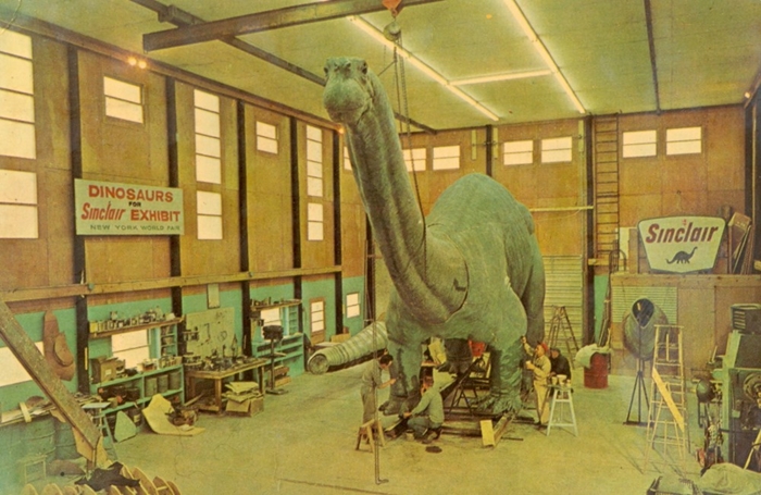 Souvenir postcards showing the Jonas Studios during construction of the Sinclair World’s Fair dinosaurs: also, a mockup of how the exhibit would be at the Fair.