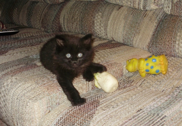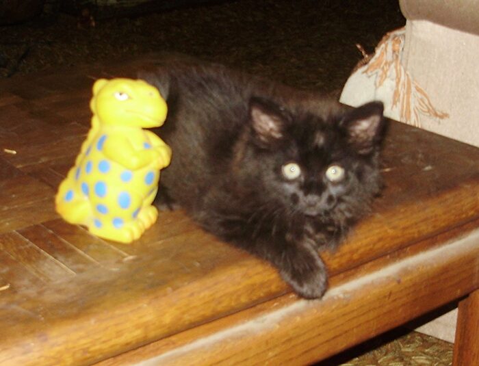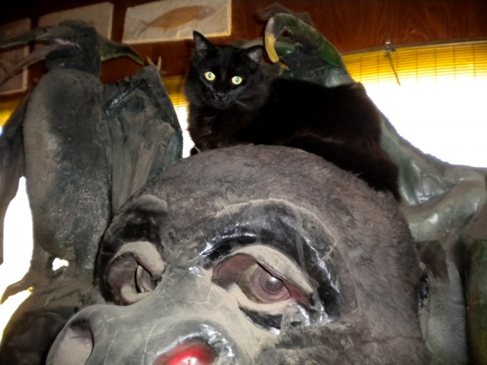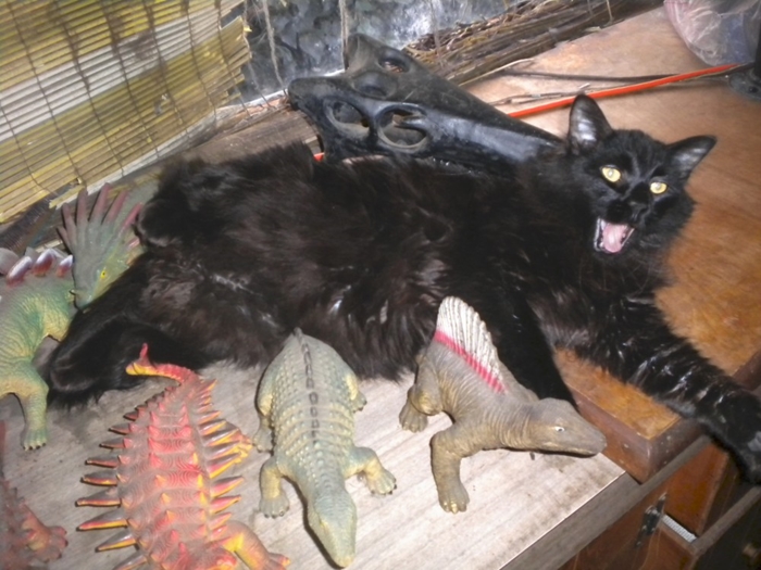 Bela the cat (supposedly Felis domesticus, although I’m inclined to suspect that he might be some new species of Panthera) also seems to like collecting dinosaur items too. These photos were taken before and after he lost his baby teeth (“grown up” teeth courtesy of “paleo-orthodontist” Mike Fredericks).