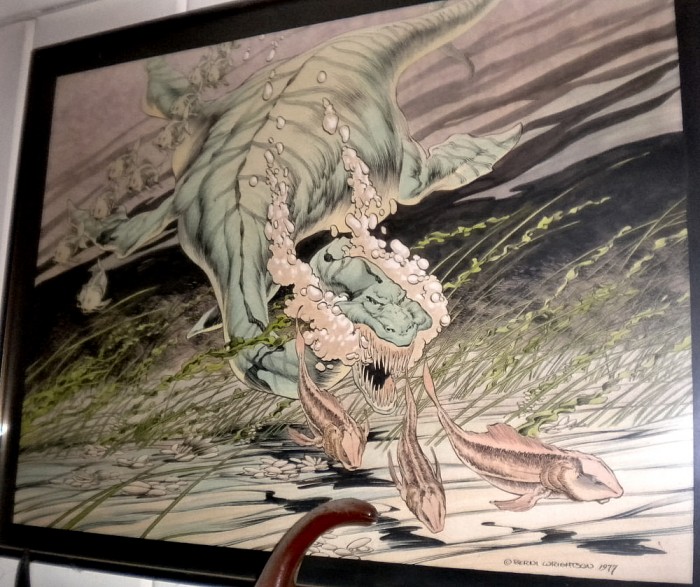 Plesiosaur original artwork by Bernie Wrightson, done for a series of preshistoric animal lithographs. Below, a sample of Bernie’s comics work involving dinosaurs.