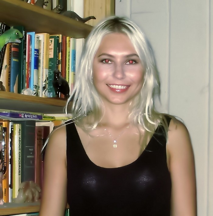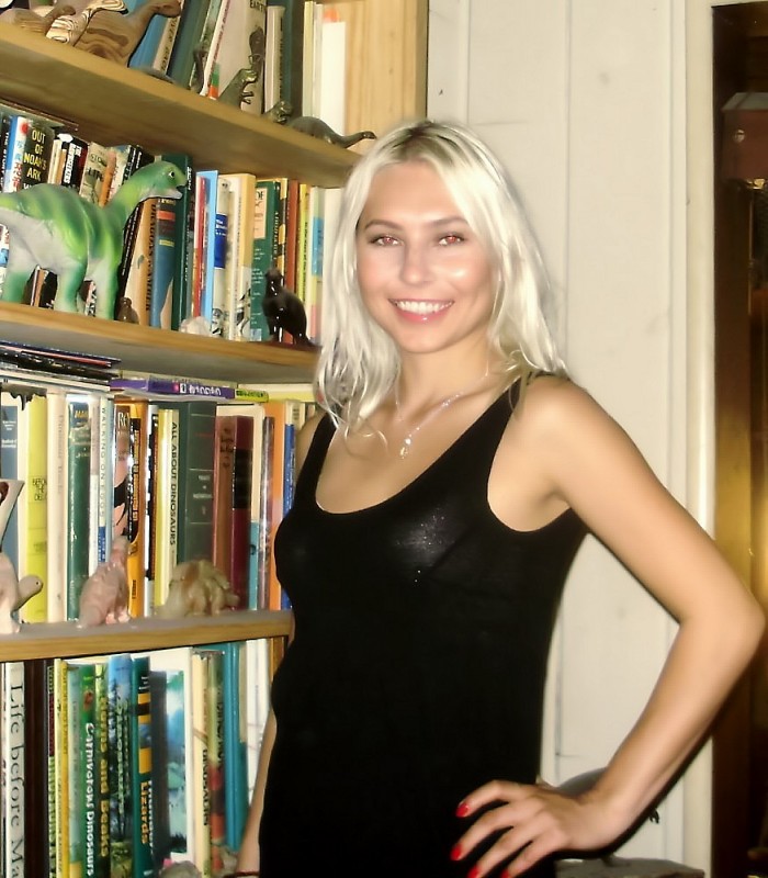 A bookcase mostly devoted to books about dinosaurs and other kinds of prehistoric life, with shelves of more miniature figures.