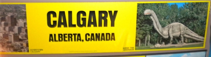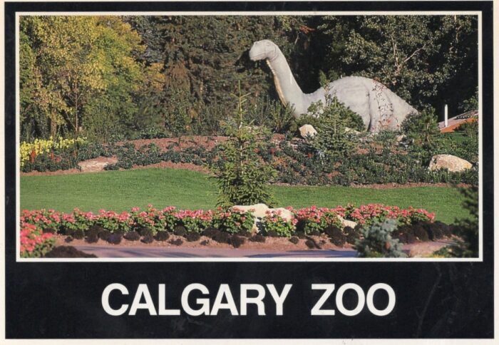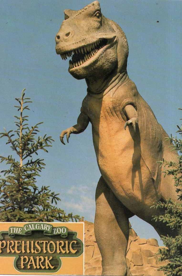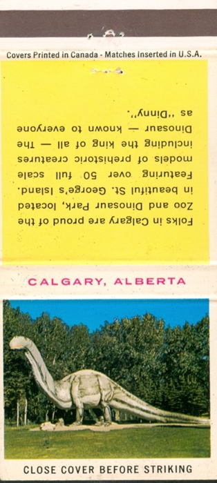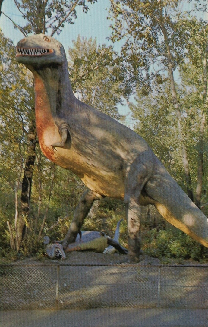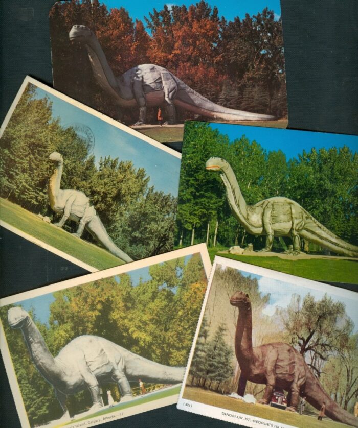 “Dinny” the dinosaur has long been a favorite attraction at the Prehistoric Park in the Calgary Zoo, Canada. The gigantic statue was built in 1935, scaled up by Aarne Koskelainen from a maquette sculpted by Charlie Bell. Here (left) are some postcards reproducing the popular dinosaur statue’s image.