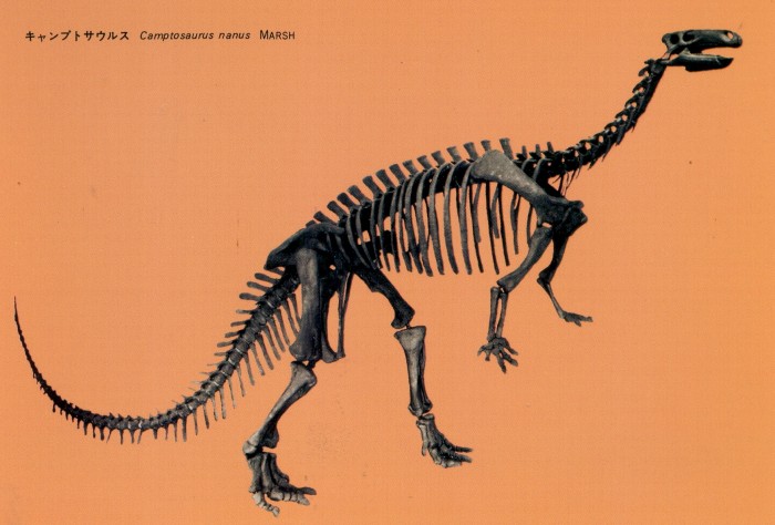 Souvenir postcard (one of a set) from the National Museum of Science, Tokyo, Japan, showing a mounted skeleton of Camptosaurus dispar.