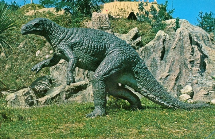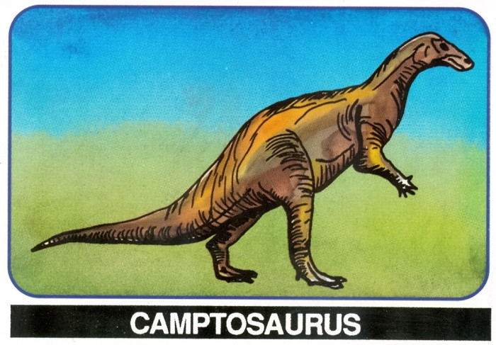 Below, # 8 in a 12-set collection of Salerno “Dinosaur Grrrahams” cards; also, a souvenir postcard showing a life-sized Camptosaurus statue at Parco Zoo del Garda – Parco dei Dinosauri, Italy.