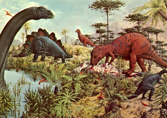 Postcard from Yale University’s Peabody Museum of Natural History, reproducing part of a painting by Rudolph Zallinger including Camptosaurus (the dinosaur in the lower right portion of the picture).