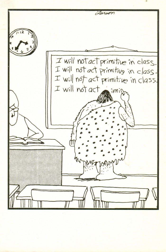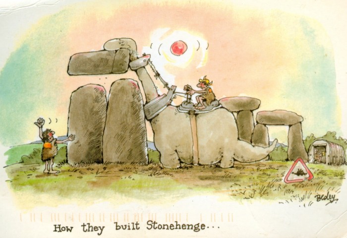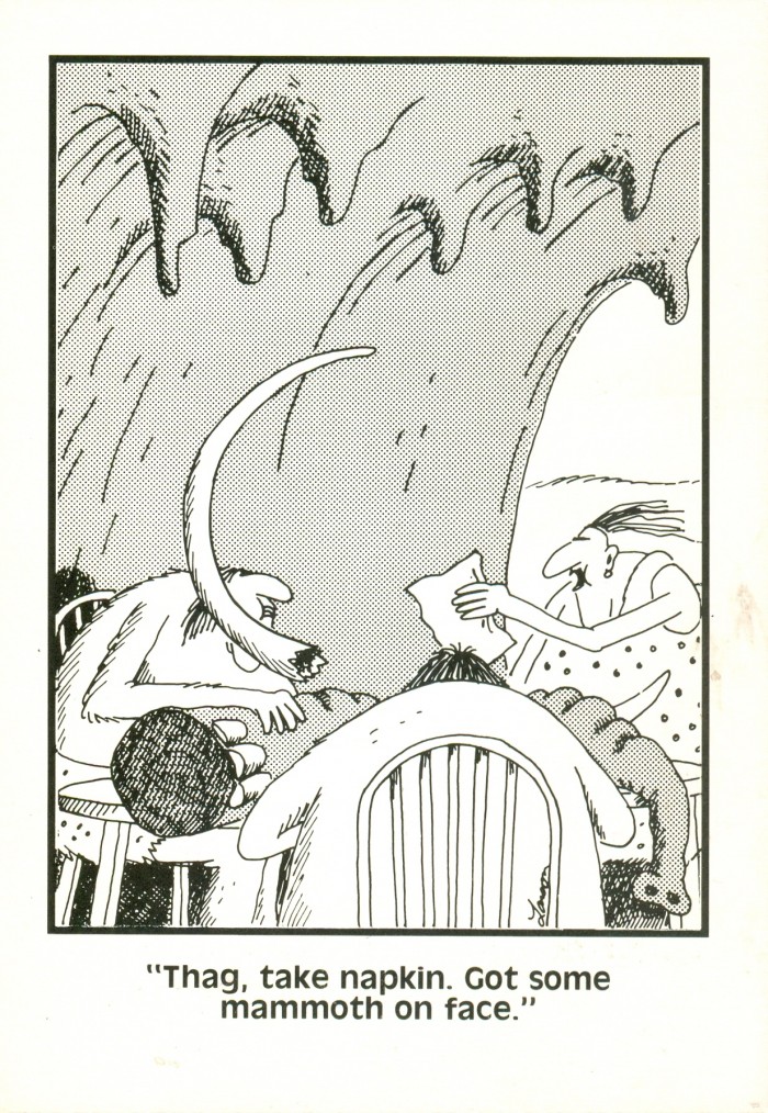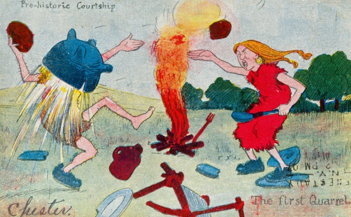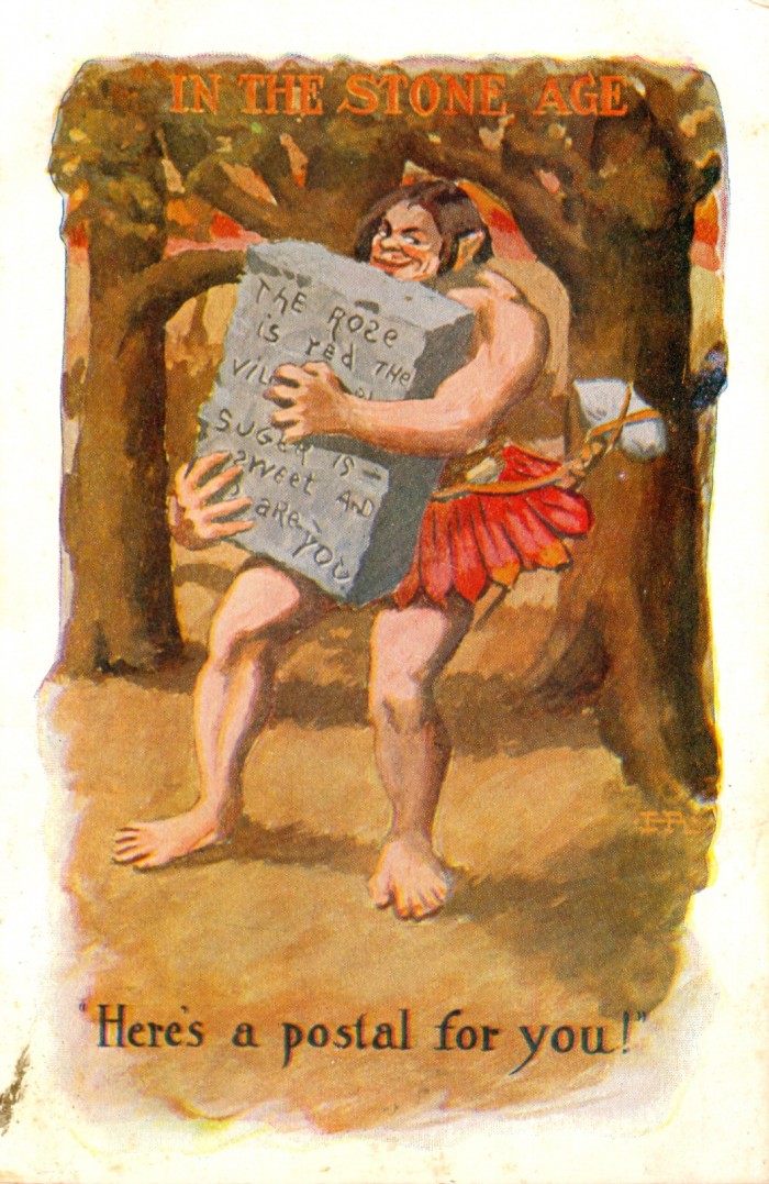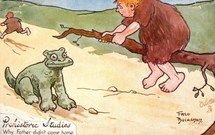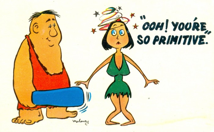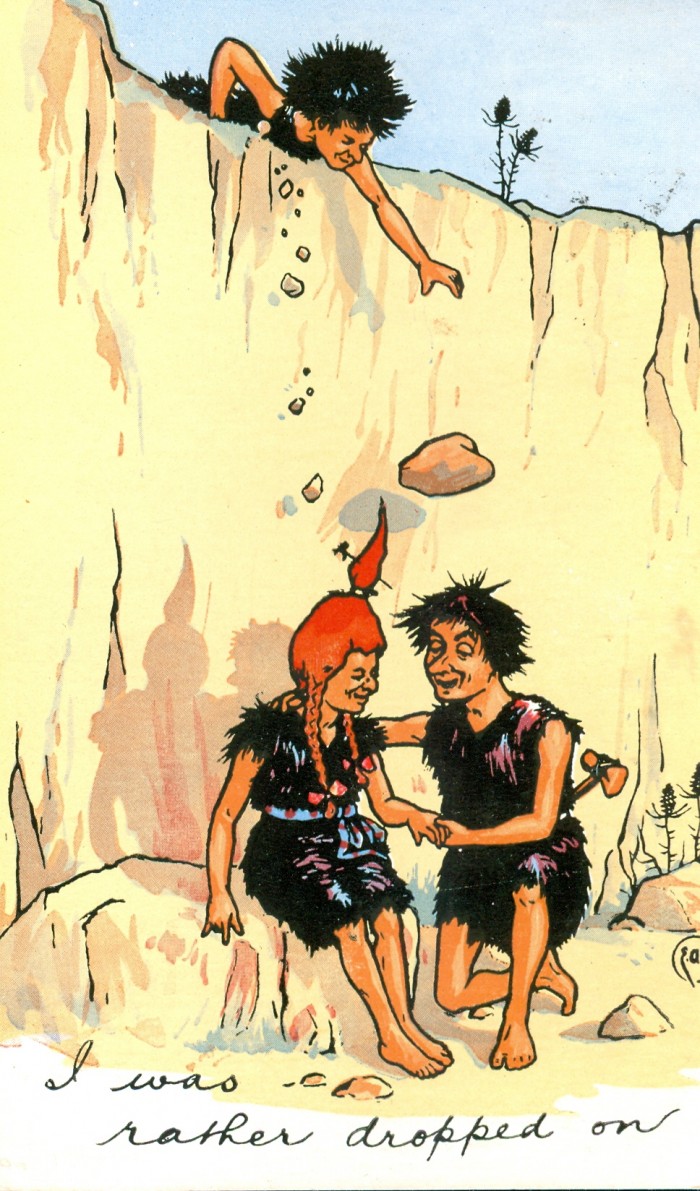Postcards featuring cave people in humorous situations have been popular for many decades, as seen in this sampling.