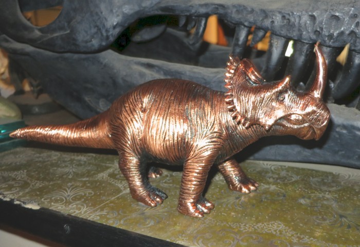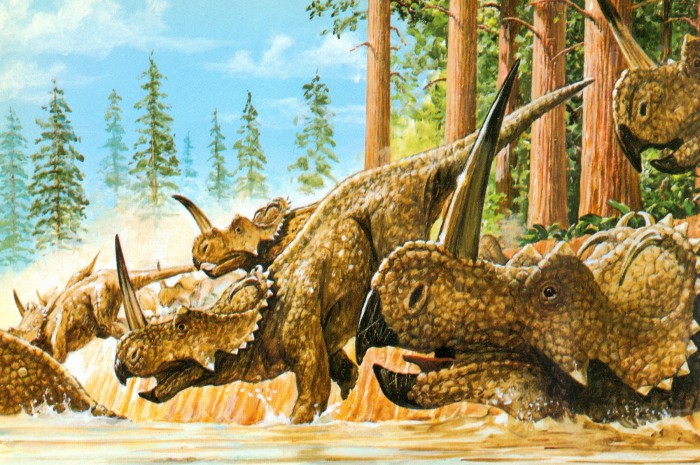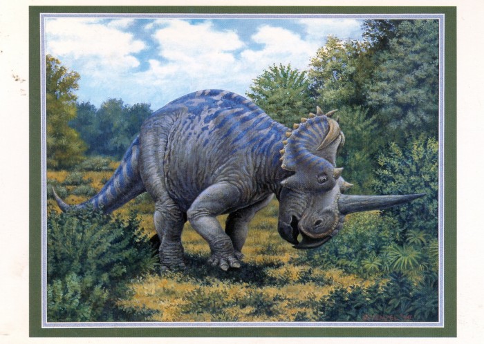 Brass figure of the horned dinosaur Centrosaurus, an item I found in 2014 at a swap meet in Las Vegas, NV. (See, there are other things to do in “Sin City” than gambling.) Below. souvenir postcards featuring Centrosaurus: the first painted by Greg Wenzel (1994), the second, showing a herd of this dinosaur, by Dave Marrs for the DinoCardz Co. series (1992).