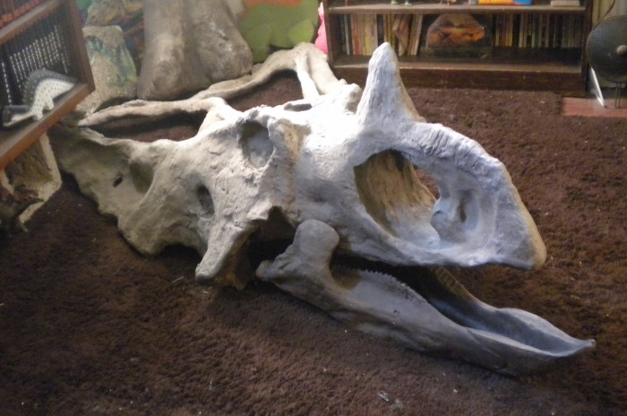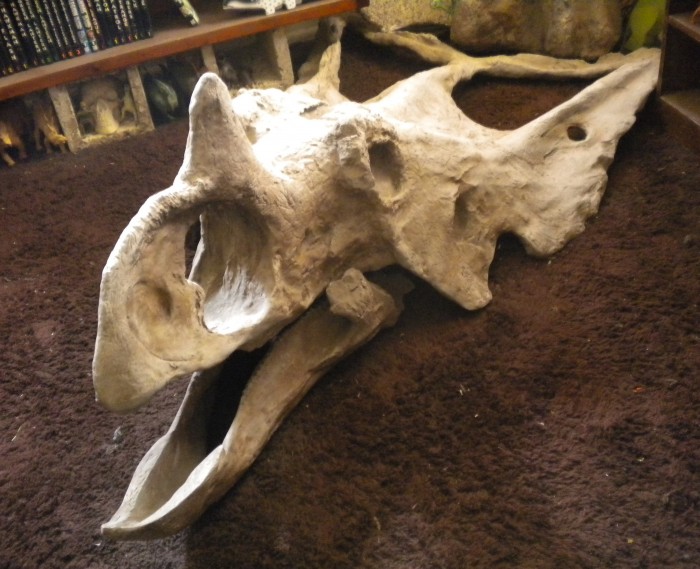 Skull (cast, left) of the giant horned dinosaur Chasmosaurus, from Valley Anatomical Preparations, Canoga Park, CA.