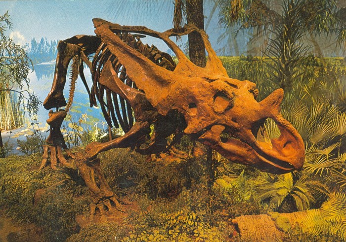Souvenir postcard showing a skeleton of Chasmosaurus belli mounted at the Royal Ontario Museum, Toronto, Canada.