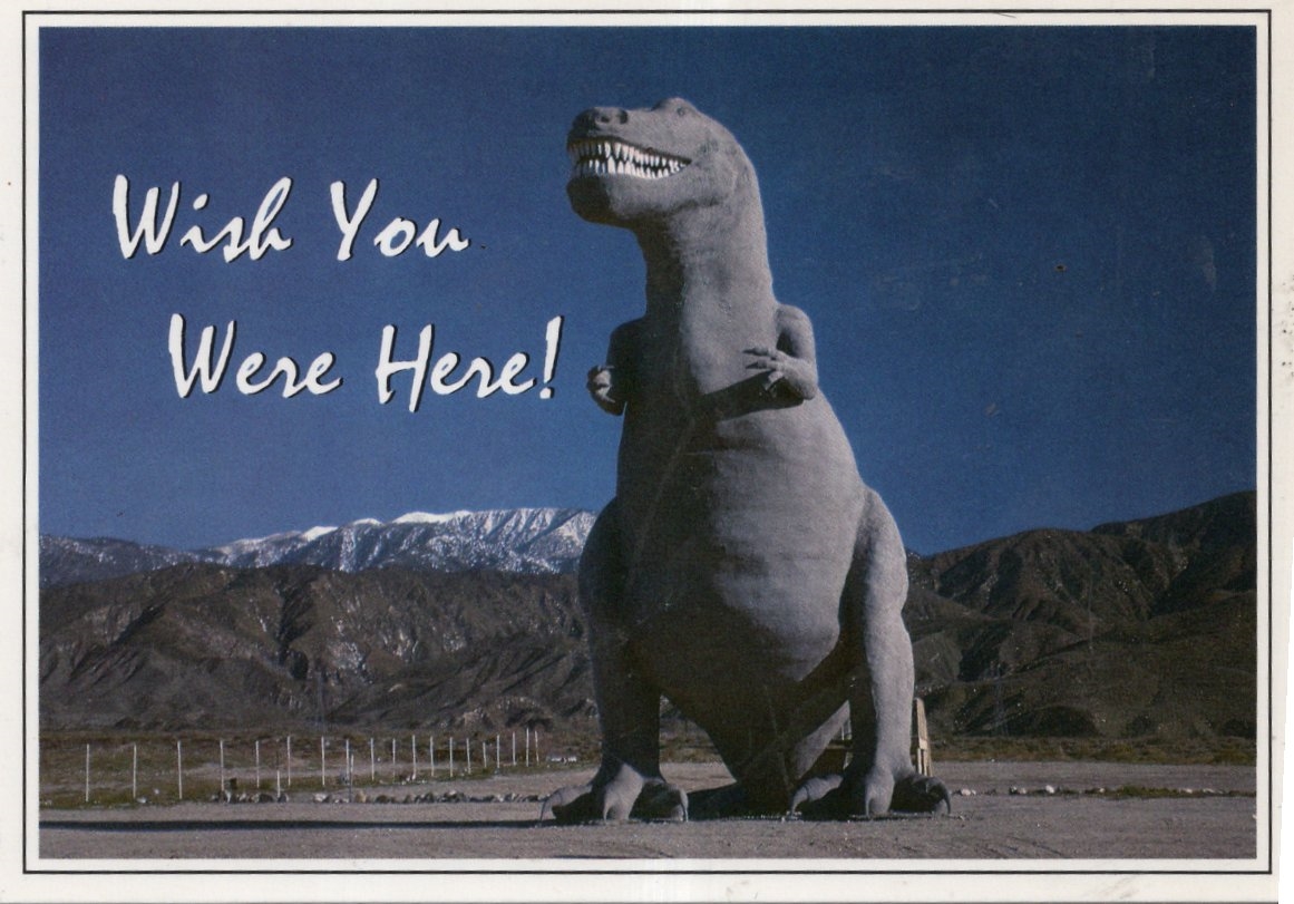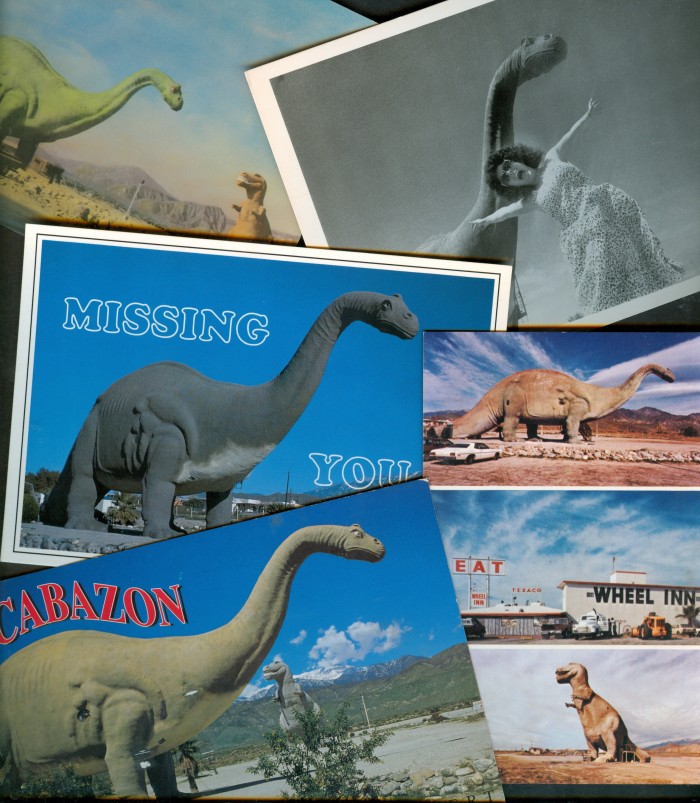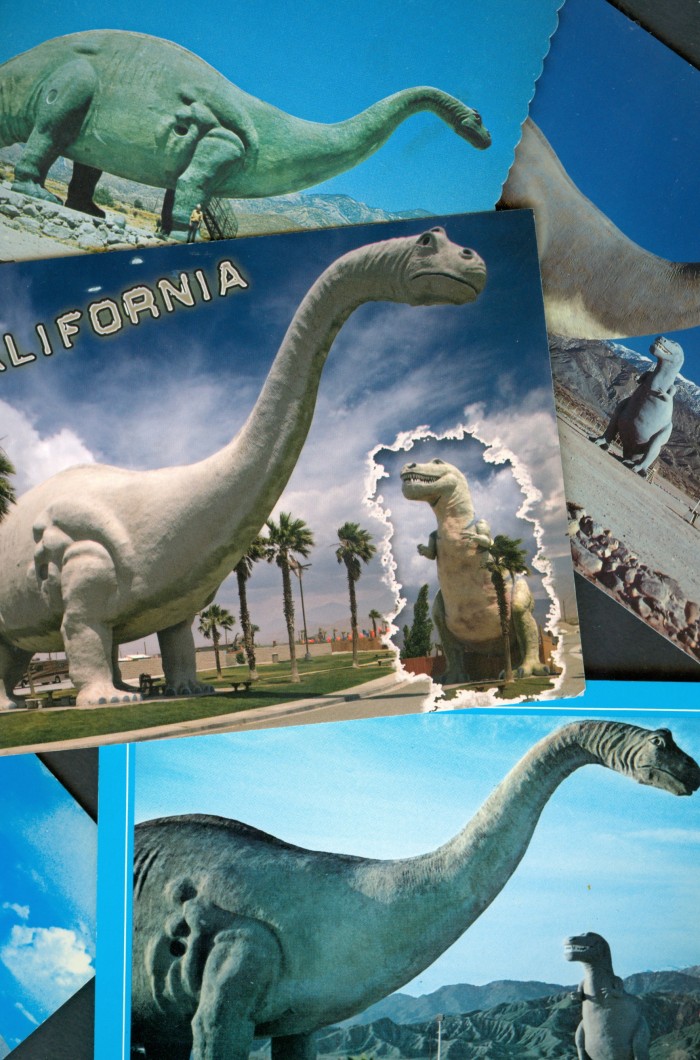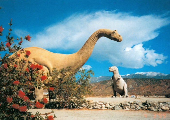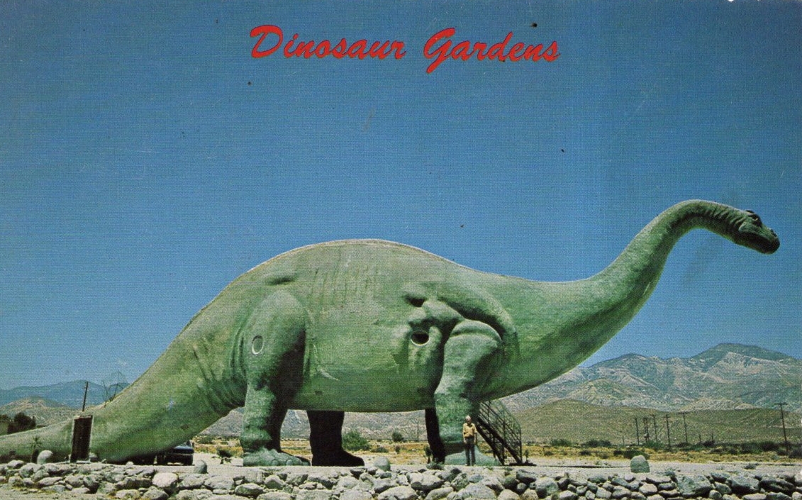 During the 1970s and 1980s, sculptor Claude K. Bell created two larger-than-life dinosaur statues — first, a Brontosaurus, later a Tyrannosaurus, seen in the above souvenir postcards — to stand outside the “Wheel Inn Restaurant” truck stop, Dinosaur Gardens, at Cabazon, CA. The Brontosaurus is hollow, serving as a “museum” and gift shop. The roadside attraction, originally called Claude Bell’s Dinosaurs., has been renamed the Cabazon Dinosaurs.