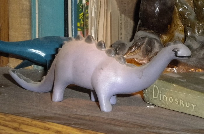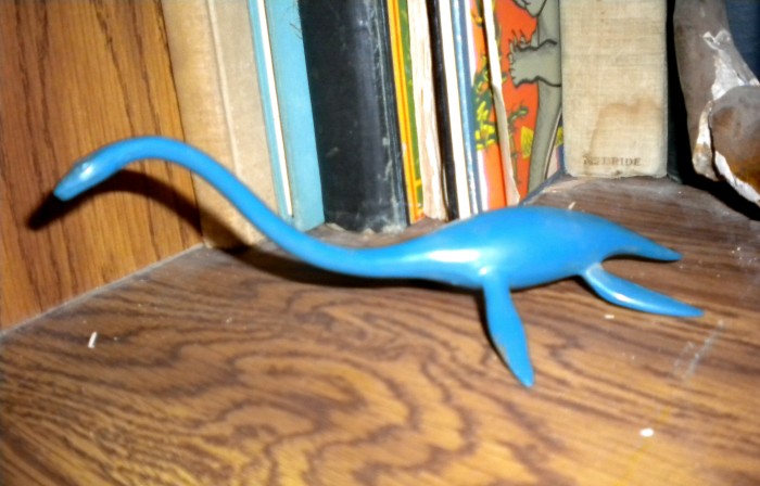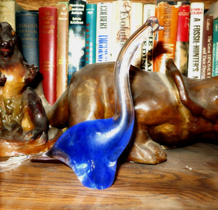 A metal plesiosaur model from the National Science Museum in Tokyo, Japan (1990s), a sauropod dinosaur figure made in Czechoslovakia (1950s?) and a glow-in-the-dark Brachiosaurus (Dynasty Gallery) made in China.