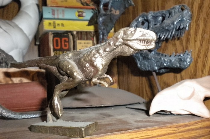 Limited-edition bronze Albertosaurus made during the 1980s by David Thomas for sale at the New Mexico Museum of Natural History and Science. The figure is a miniature version of Dave’s actual-sized bronze Albertosaurus (nicknamed “Alberta”) statue made to stand — facing off “Spike,” Dave’s Pentaceratops — outside the New Mexico Museum of Natural History and Science, Albuquerque.