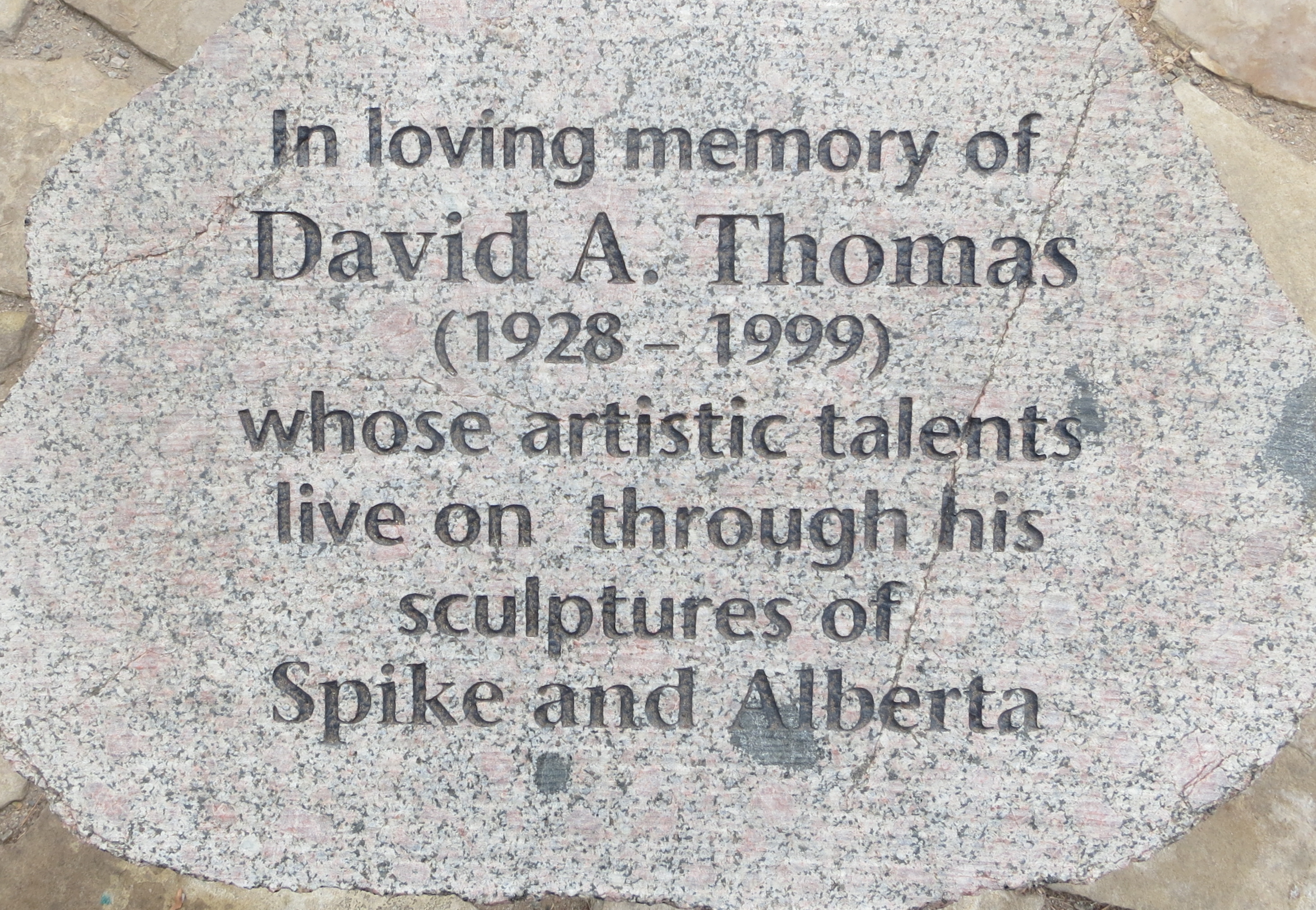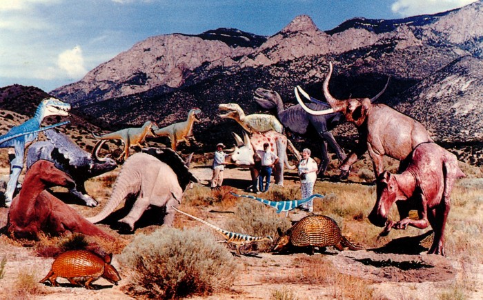 Souvenir postcard (below, signed on the back by Dave) showing some of David Thomas’ prehistoric-animal sculptures and another showing his Albertosaurus confronting “Spike” outside the Albuquerque museum, also a photo I took of a plaque accompanying those figures.