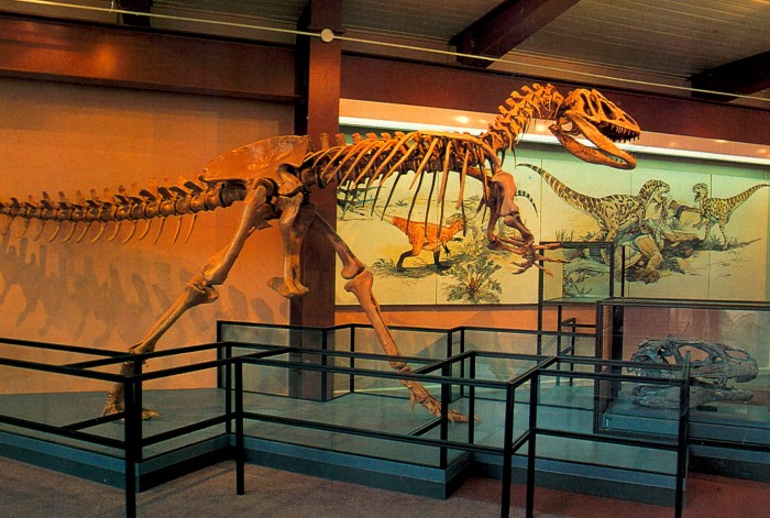 Souvenir postcard from the Dinosaur Nature Association showing the finest Allosaurus skeleton yet collected, mounted at Dinosaur National Monument’s visitors center.