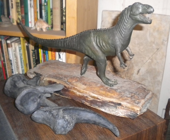 Bronze Allosaurus sculpted by David Thomas — also Allosaurus caudal (tail) vertebra and ungual (claw), casts, all from DINOLAB, Salt Lake City.