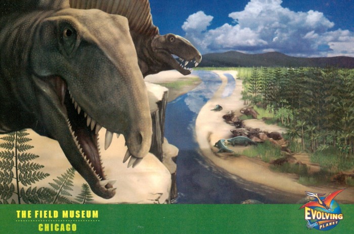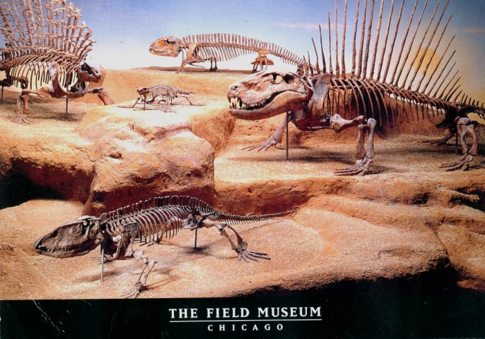 Postcards (above right and below left) from The Field Museum showing a skeleton of Dimetrodon gigas (and other pelycosaurs) and reproducing a painting by artist Karen Carr of Dimetrodon grandis.