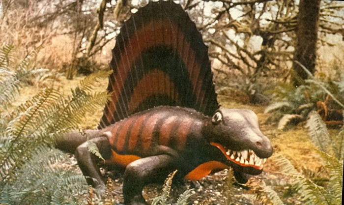 Postcard from Prehistoric Gardens on the Oregon Coast Highway 101, neat Port Orford, showing a full-scale statue of Dimetrodon.