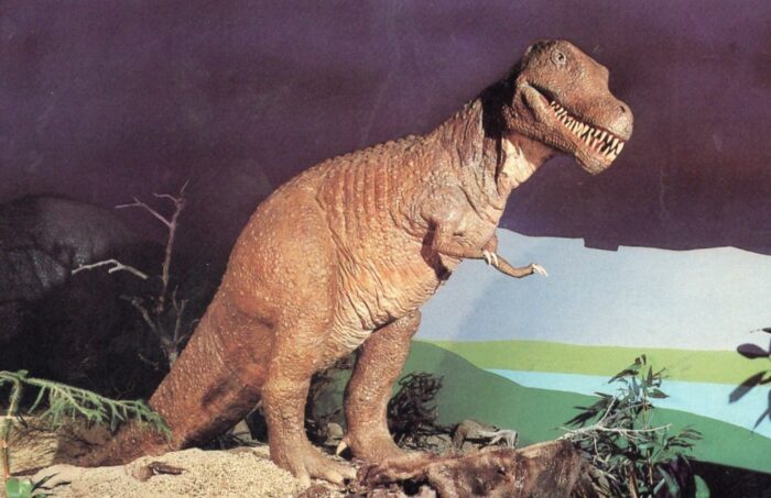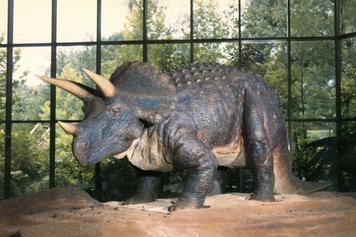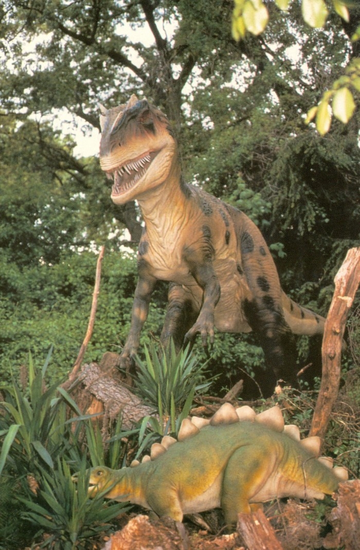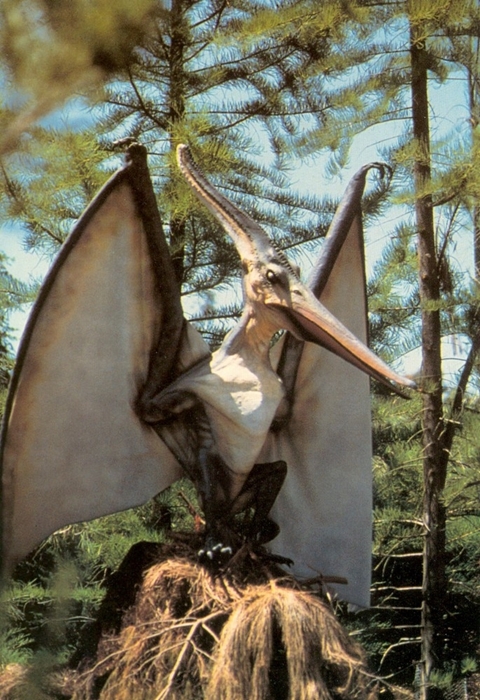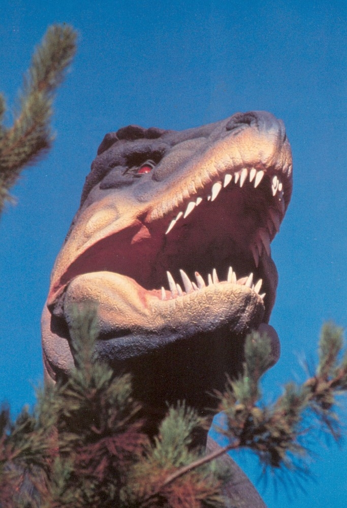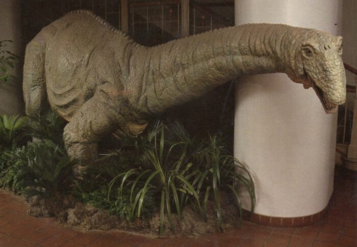 Dinamation International, now extinct., was a company based in Irvine, California that sold and rented life-sized animatronic figures of dinosaurs and other prehistoric animals to museums, trade shows and other venues. At first, the company leased figures made in Japan by a company called Kokoro, then went into production on its own mechanical figures under the direction of well-known paleontologists. Some of Dinamation’s creatures are shown in the postcards displayed here.