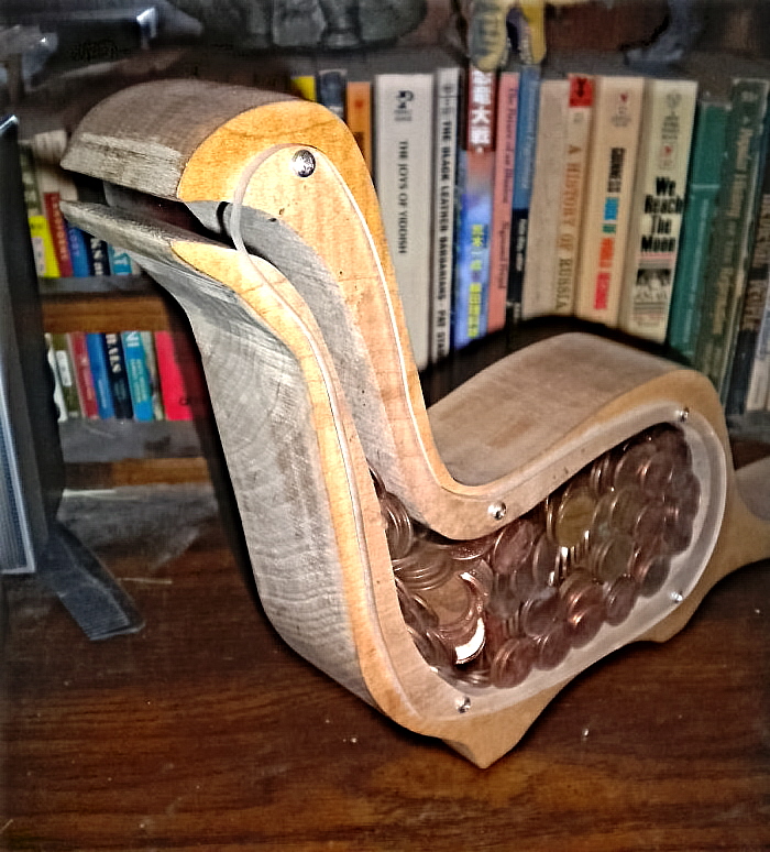 A wooden and plastic dinosaur bank for saving copper pennies to buy more dino-items.