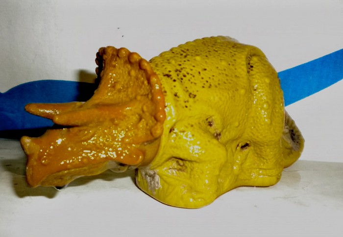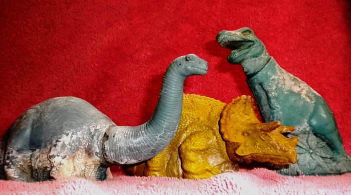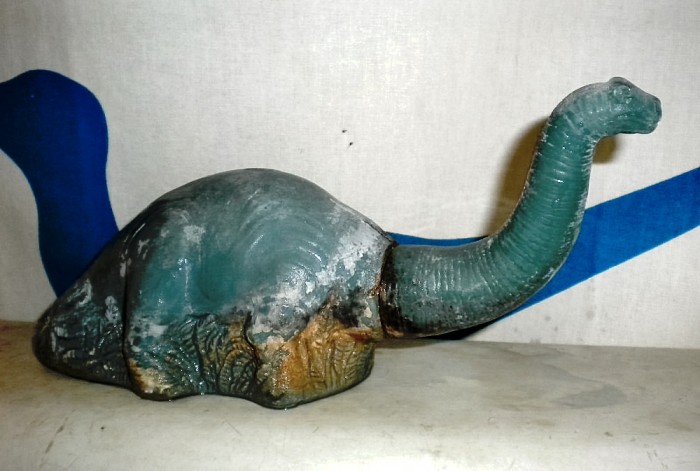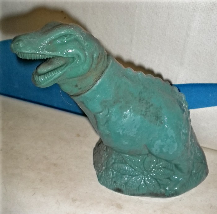 Back in the 1970s, these plastic containers by Avon were filled with bubble bath liquid. They were based upon dinosaurs as depicted by artist Rudolph F. Zallinger in the “Age of Reptiles” painting he did for the Peabody Museum of Natural History, Yale University, reproduced in this souvenir postcard.