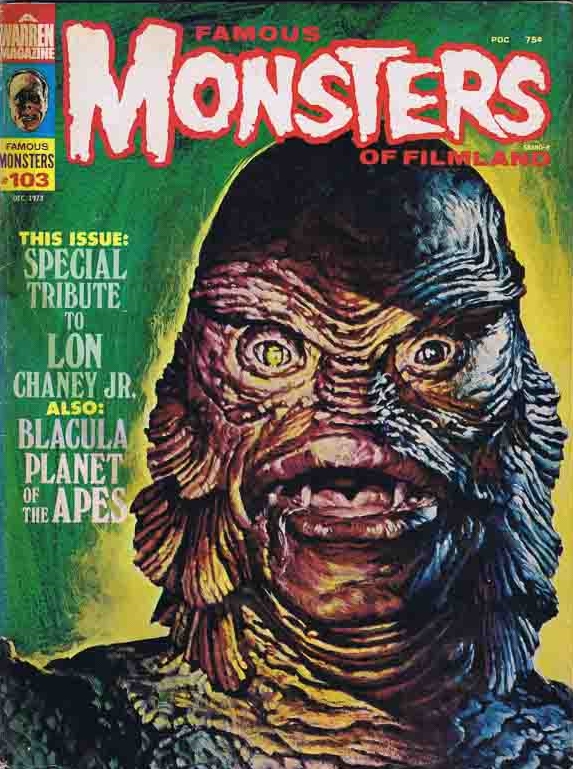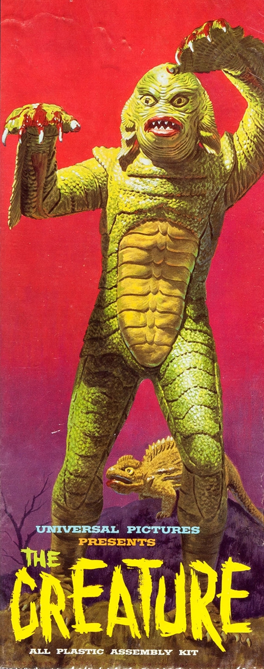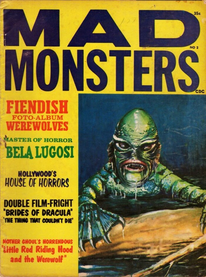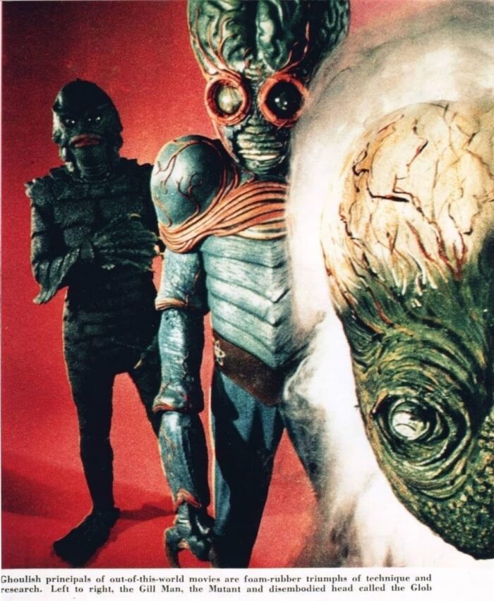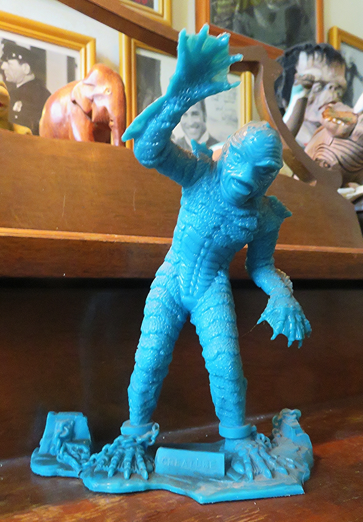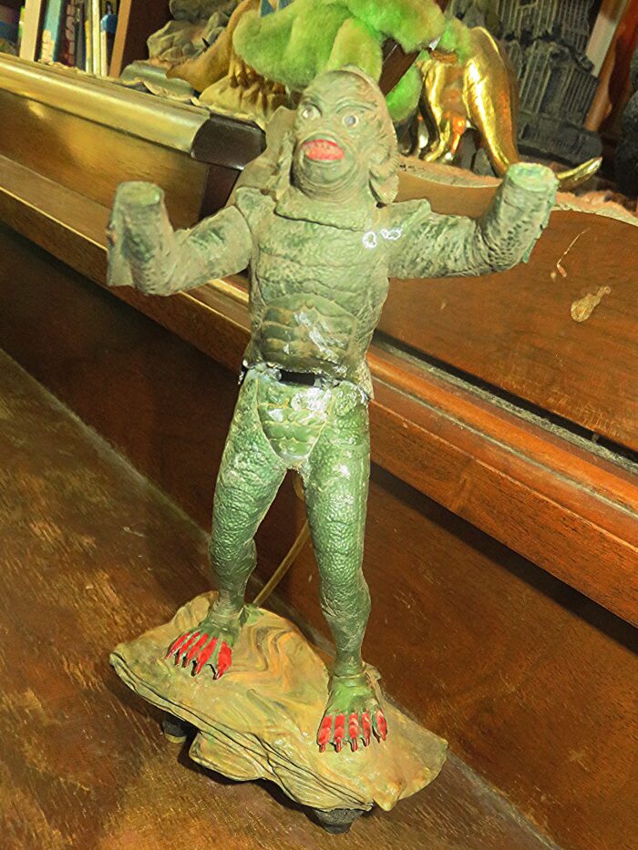 The “Gill Man” — an imaginary prehistoric monster part fish and part humanoid — starred in three motion pictures made during the 1950s by Universal-International — Creature from the Black Lagoon (1954), Revenge of the Creature (1955) and The Creature Walks Among Us (1956). There have been many collectible items sold over the years pertaining to the “Creature,” among them this animated aquarium accessory (Pen Plax, 1970), plastic figure (Marx, 1963s) and bust bank (CE, 2012). Alas, I no longer have the Aurora model kit. The Incredible Science Fiction issue cover-features an article I wrote about the Creature.