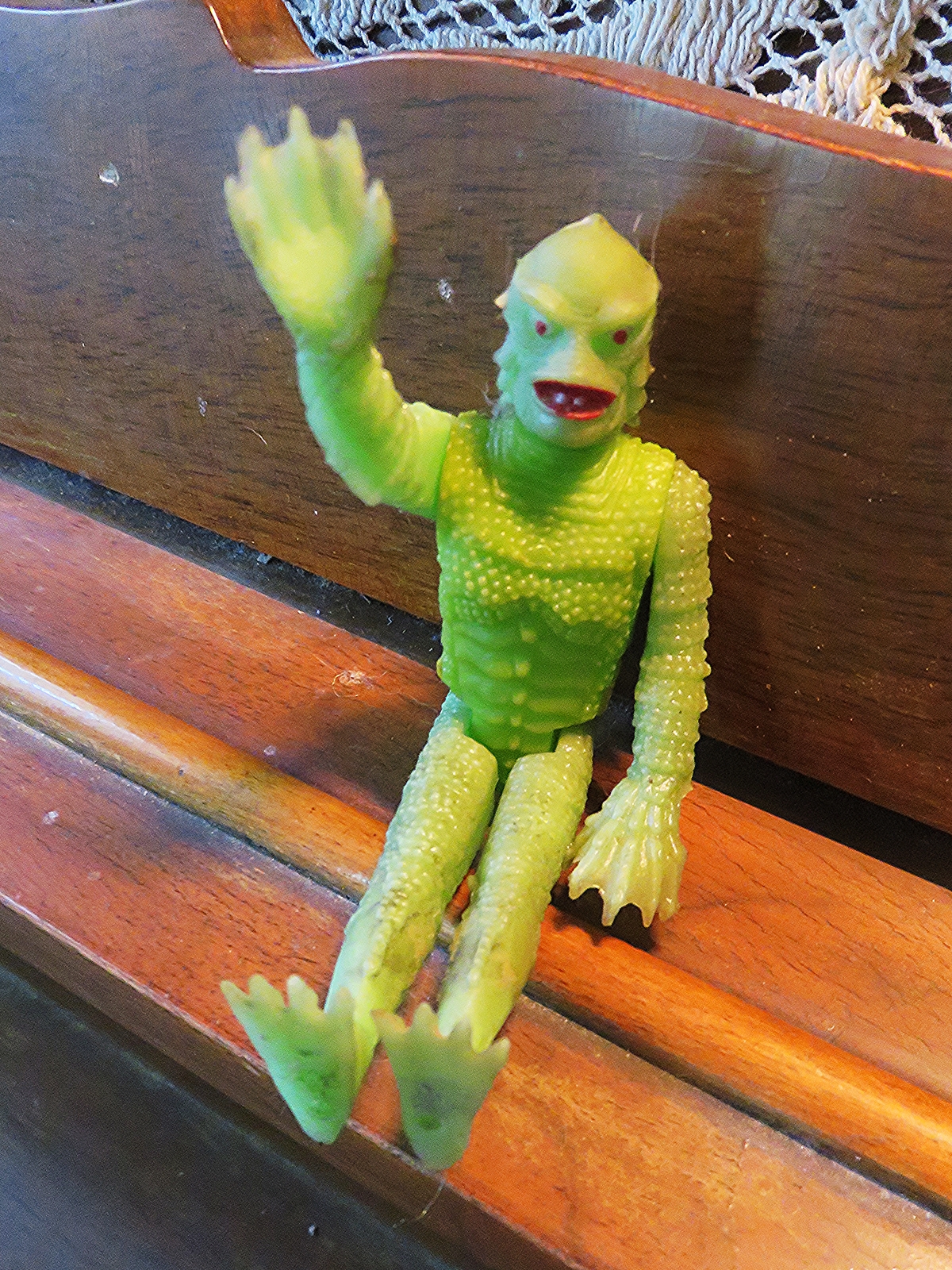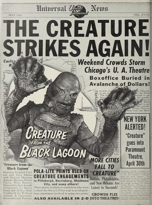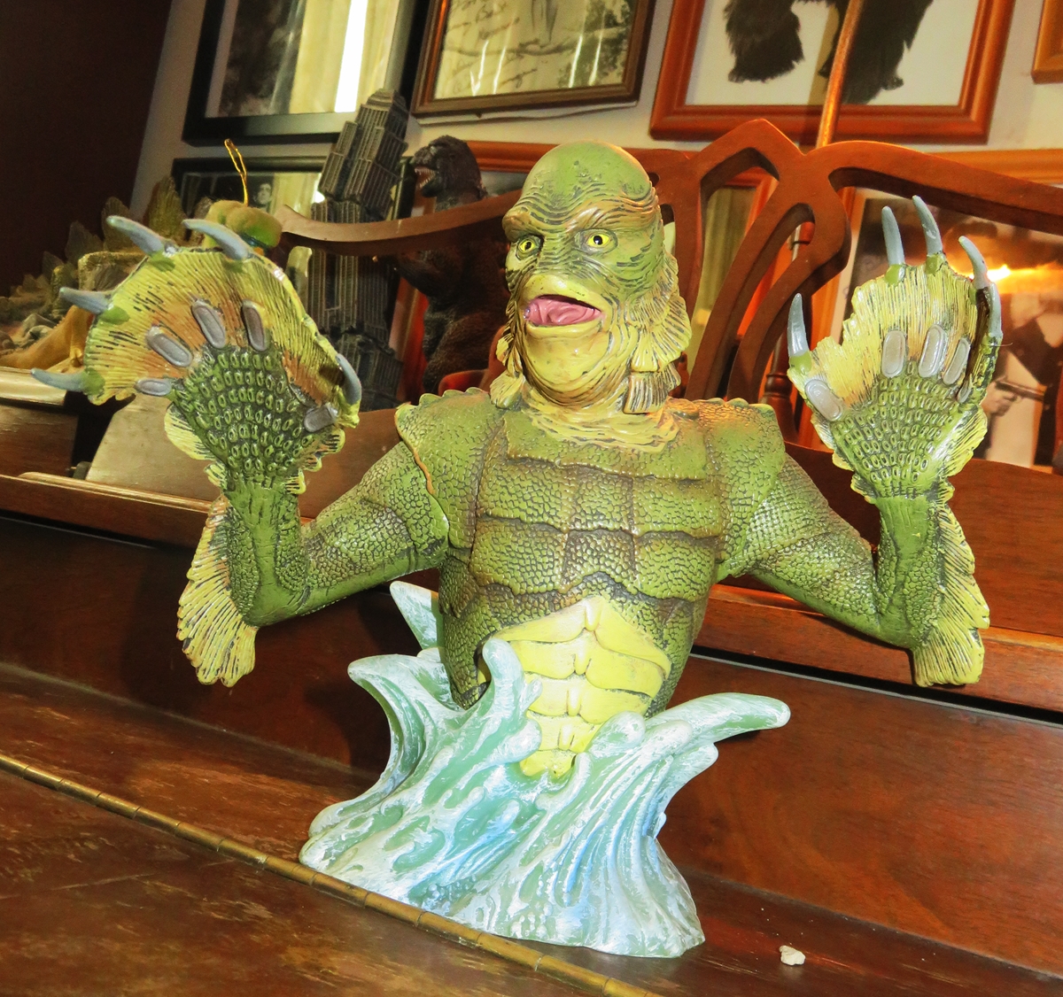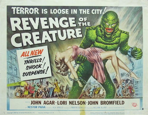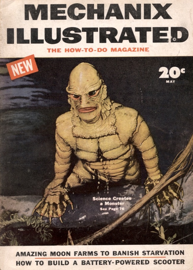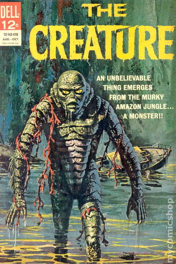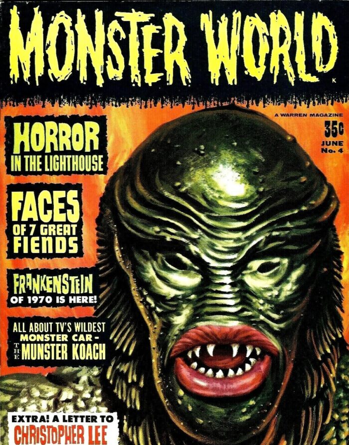 The “Gill Man” — an imaginary prehistoric monster part fish and part humanoid — starred in three motion pictures made during the 1950s by Universal-International — Creature from the Black Lagoon (1954), Revenge of the Creature (1955) and The Creature Walks Among Us (1956). There have been many collectible items sold over the years pertaining to the “Creature,” among them this animated aquarium accessory (Pen Plax, 1970), plastic figure (Marx, 1963s) and bust bank (CE, 2012). Alas, I no longer have the Aurora model kit. The Incredible Science Fiction issue cover-features an article I wrote about the Creature.