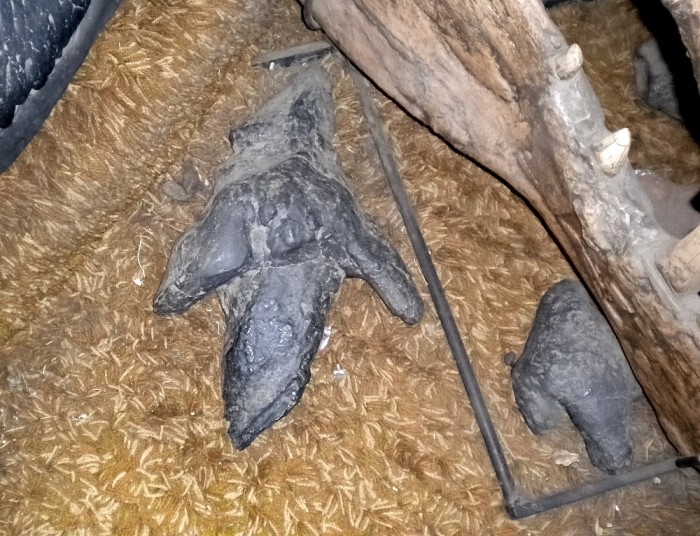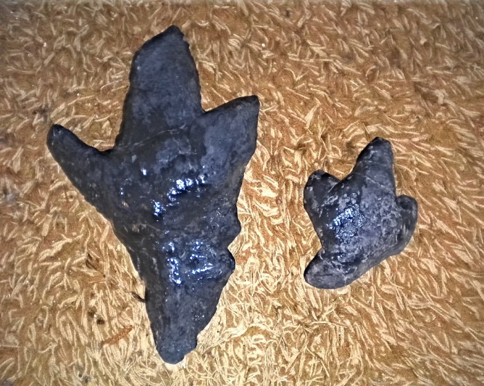 Theropod (larger) and ornithopod dinosaur footprints (casts) from the Upper Jurassic Morrison Formation of Utah.