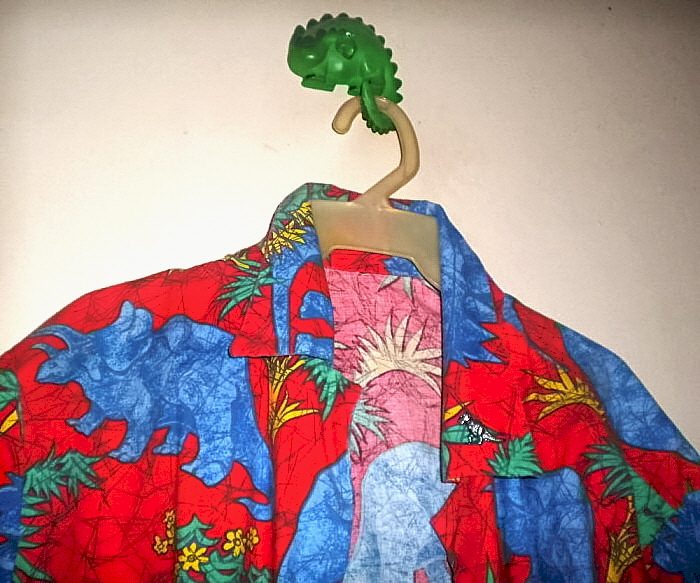 Hanging on the bedroom door, a dinosaur Hawaiian shirt (on a dinosaur hanger, of course). Some people look better than others wearing a dinosaur Hawaiian shirt.