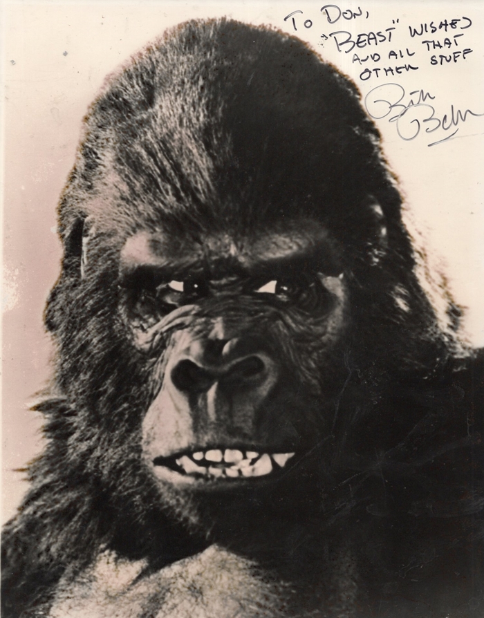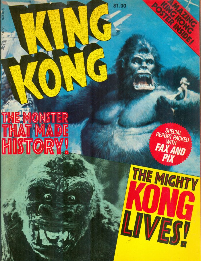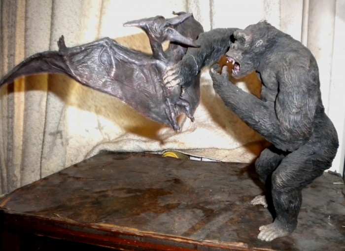 Below, resin Pteranodon vs. Kong model kit from Kaiyodo, based on the stop-motion models (sculpted by Marcel Delgado and animated by Willis O’Brien) and scene from the 1933 classic original King Kong. Also (below), collectible still photos showing pre-production art by Byron Crabbe and the actual scene as it appeared in the movie.