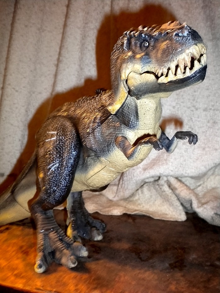 Mechanical “V. Rex” toy from the latest King Kong movie remake. (The mouth is one of its moving parts.); and a cold cast model (Columbia Heritage, 2001) based on Ray Harryhausen’s Phororhacos stop-motion model from the 1961 movie Mysterious Island.