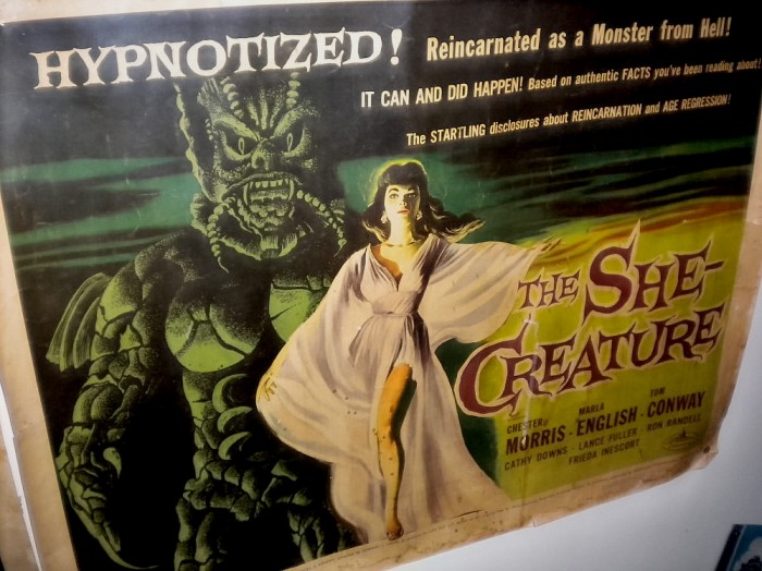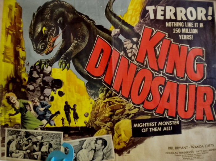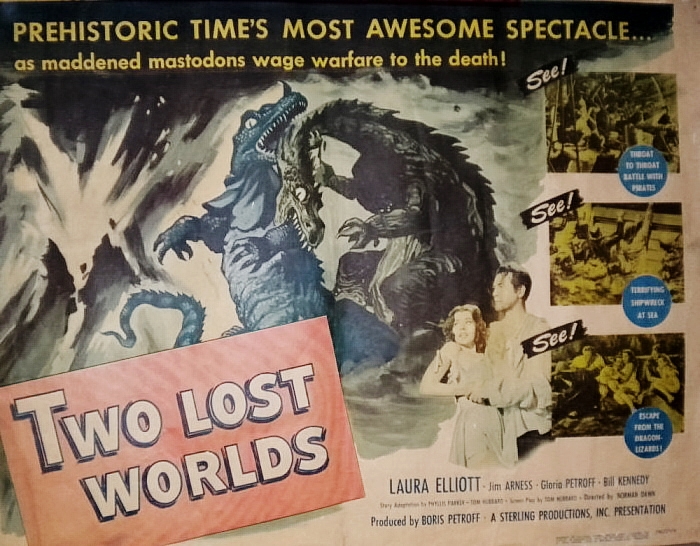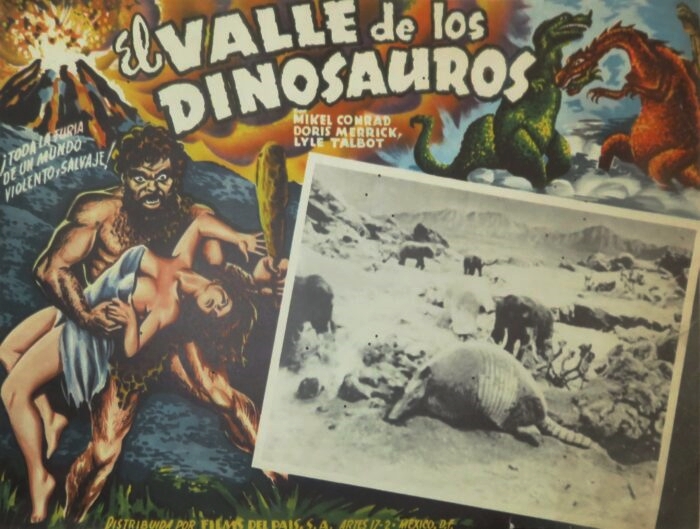 Original posters and lobby cards from movies with prehistoric themes. To see collectible items pertaining to some other movies featuring dinosaurs, CLICK HERE and also on the following links: One Million B.C. … Creature from the Black Lagoon … Godzilla and sequels … Asian movie monsters … Reptilicus … Baby, Secret of the Lost Legend … and Carnosaur. For Jurassic Park items, click here … here … and here. To see more such imagery from movies like Dinosaurus and The Animal World, including some sculptures by John Goodwin, click here. And for some posters for more movies featuring prehistoric creatures click here.