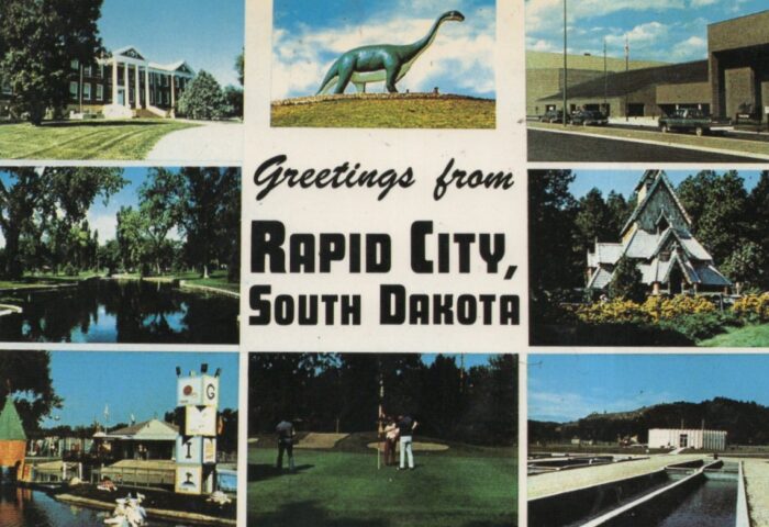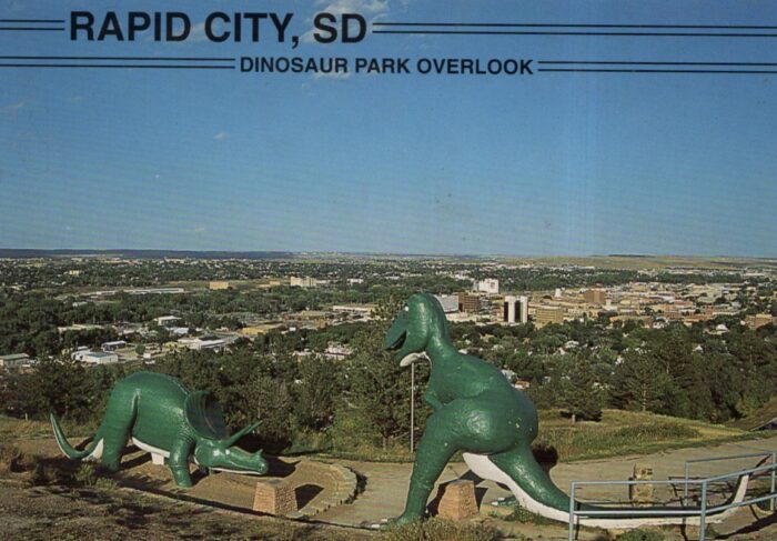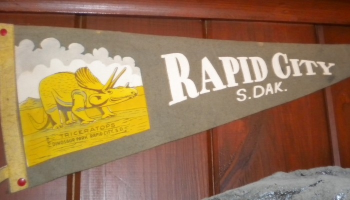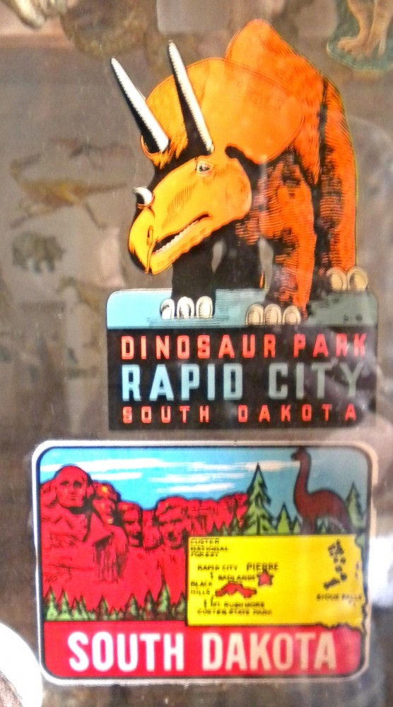 In the little hallway outside the bedroom, a metal Triceratops license plate souvenir from Dinosaur Park, Rapid City, SD, the first of what would eventually become just one of many prehistoric parks in the United State.