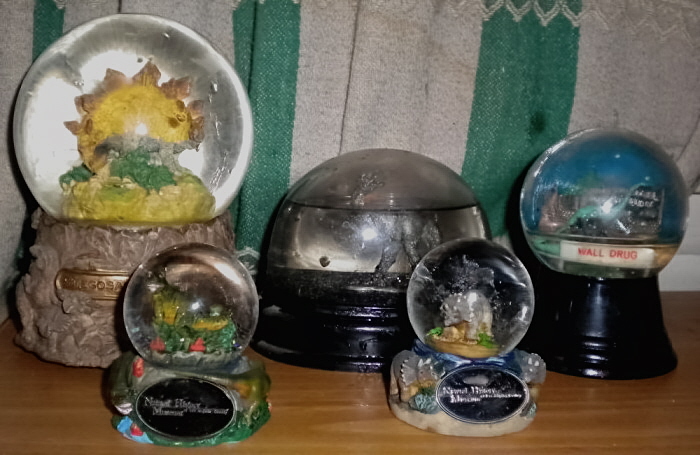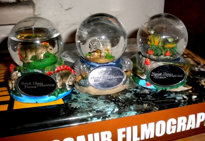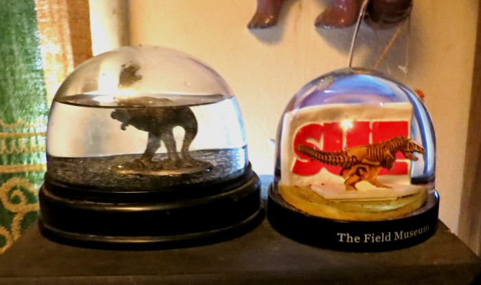 Dinosaur snow globes from Three Jays Imports, Inc. (1993), Glenview, Illinois, Wall Drug, South Dakota, an unknown manufacturer in China, The Field Museum (“SUE“) and the Natural History Museum of Los Angeles County.