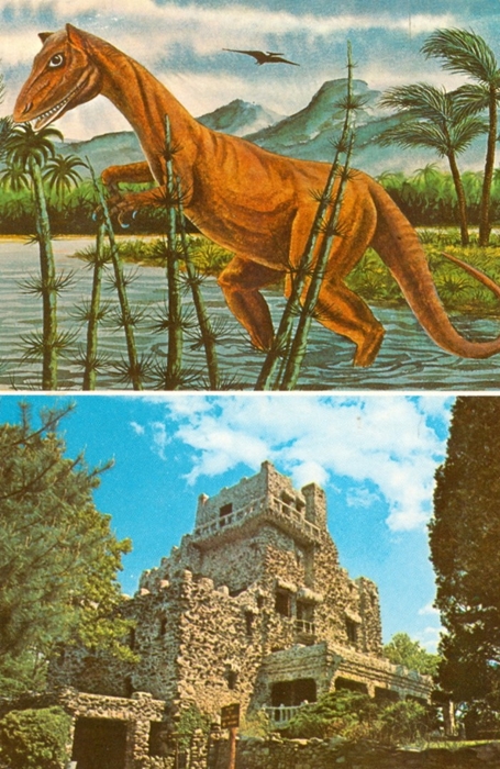 Some souvenir postcards from Dinosaur State Park in Rocky Hill, Connecticut, which displays a fine collection of Early Jurassic carnivorous dinosaur tracks named Eubrontes. The full-scale model of Dilophosaurus, the kind of dinosaur that may have made these footprints, was designed by Gregory S. Paul. The diorama depicts what this area of Connecticut was probably like 185 million years ago.