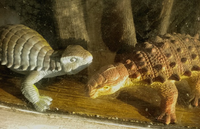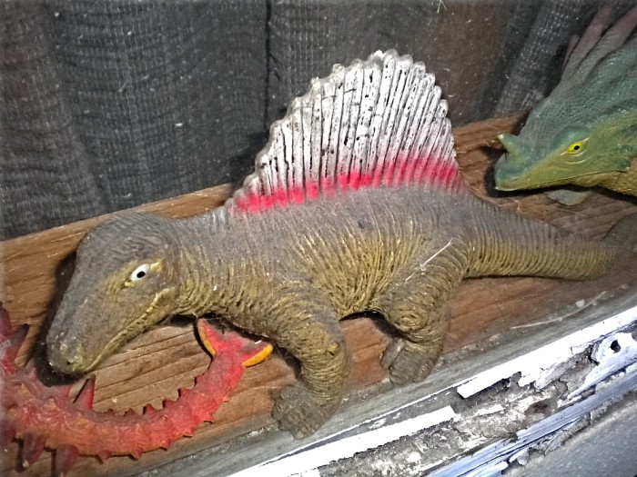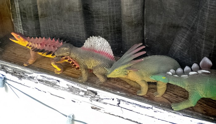 Prehistoric figures made in China looking out toward the driveway and the backyard.