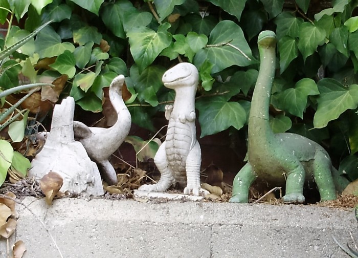 Plaster lawn ornaments, bought ca. 1980. The green sauropod was painted by artist Rick Hoberg.