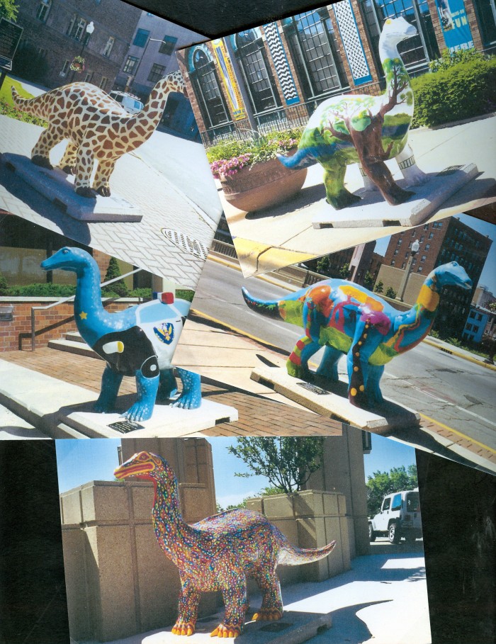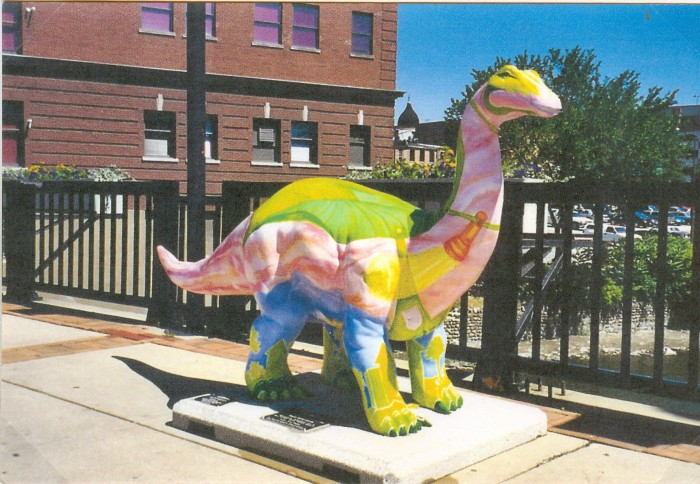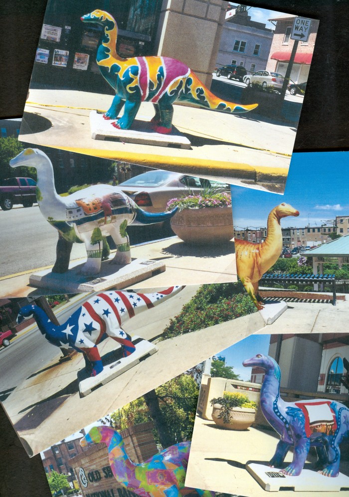 In 2008, the Burpee Museum of Natural History in Aurora, IL, participated in the “Dinosaurs on Parade” event, where brightly colored and decorated sauropod dinosaur statues appeared all over town. These Mandro postcards show some of those statues.