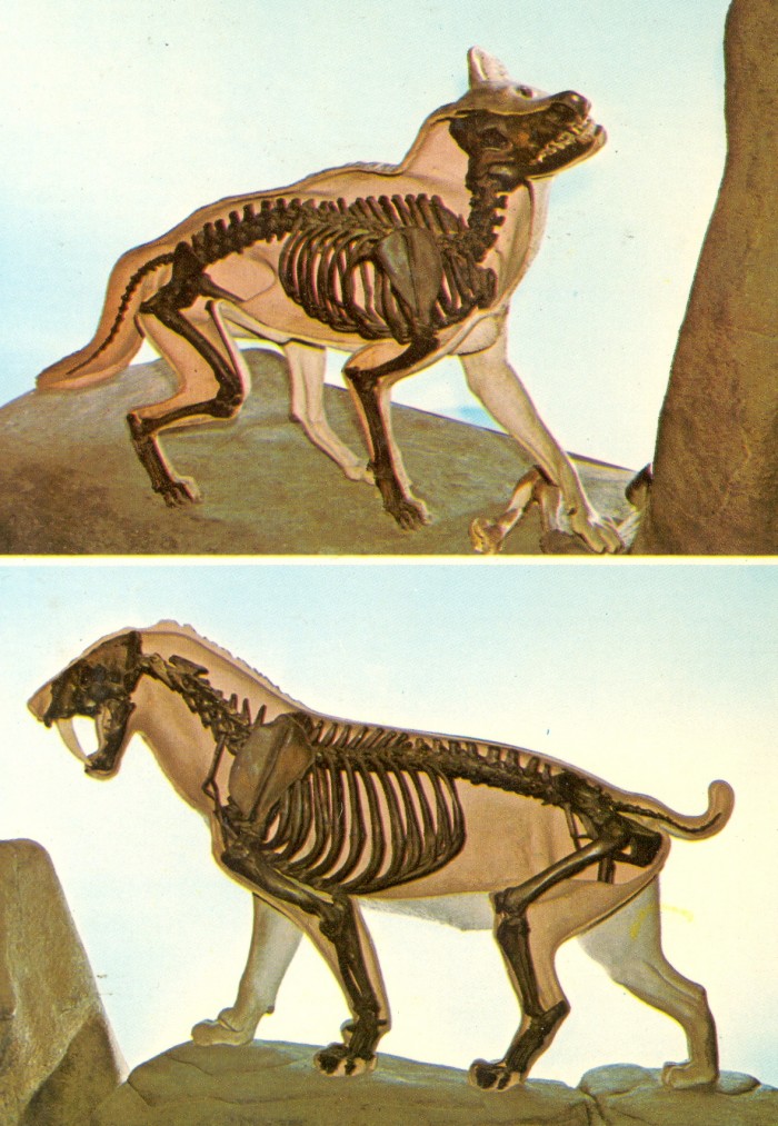 Souvenir postcard from the Carnegie Museum of Natural History, Pittsburgh, PA, showing mounted skeletons of the Ice Age carnivores Canis dirus (top) and the saber-toothed cat Smilodon fatalis.