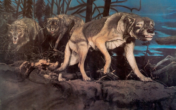 Postcard from the George C. Page Museum of La Brea Discoveries, Los Angeles, CA (now referred to as the La Brea Tar Pits and Museum). showing a diorama of a pack of life-sized dire wolves.