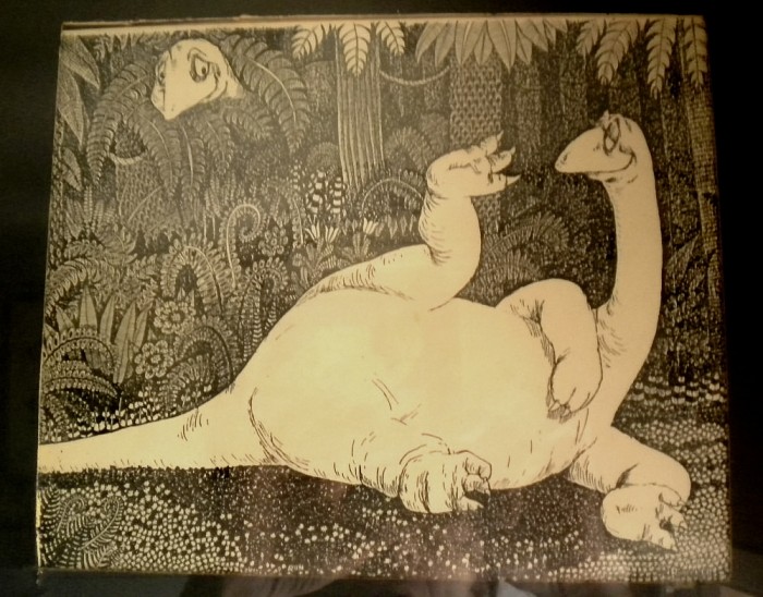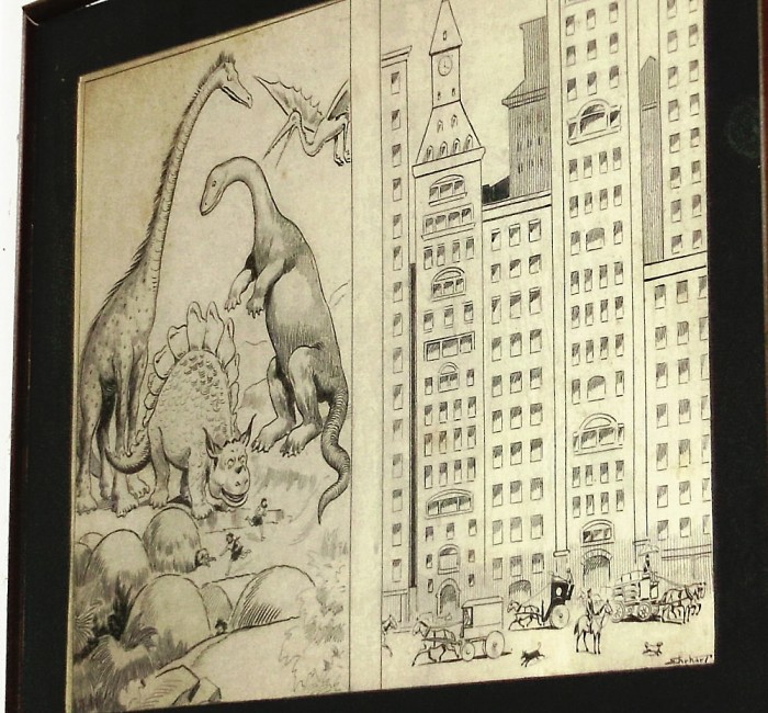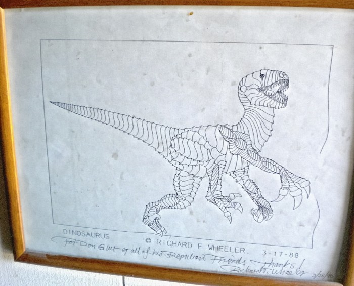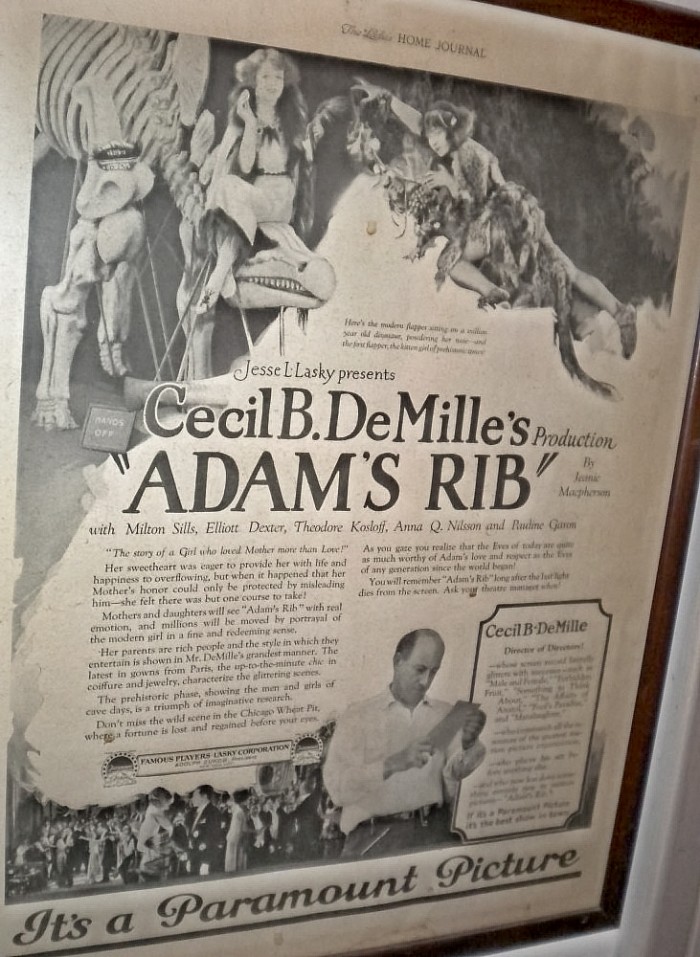 Also (below) on the “black and white art walls,” an early digital Deinonychus created by Richard F. Wheeler and an original magazine advertisement for a 1923 silent movie.