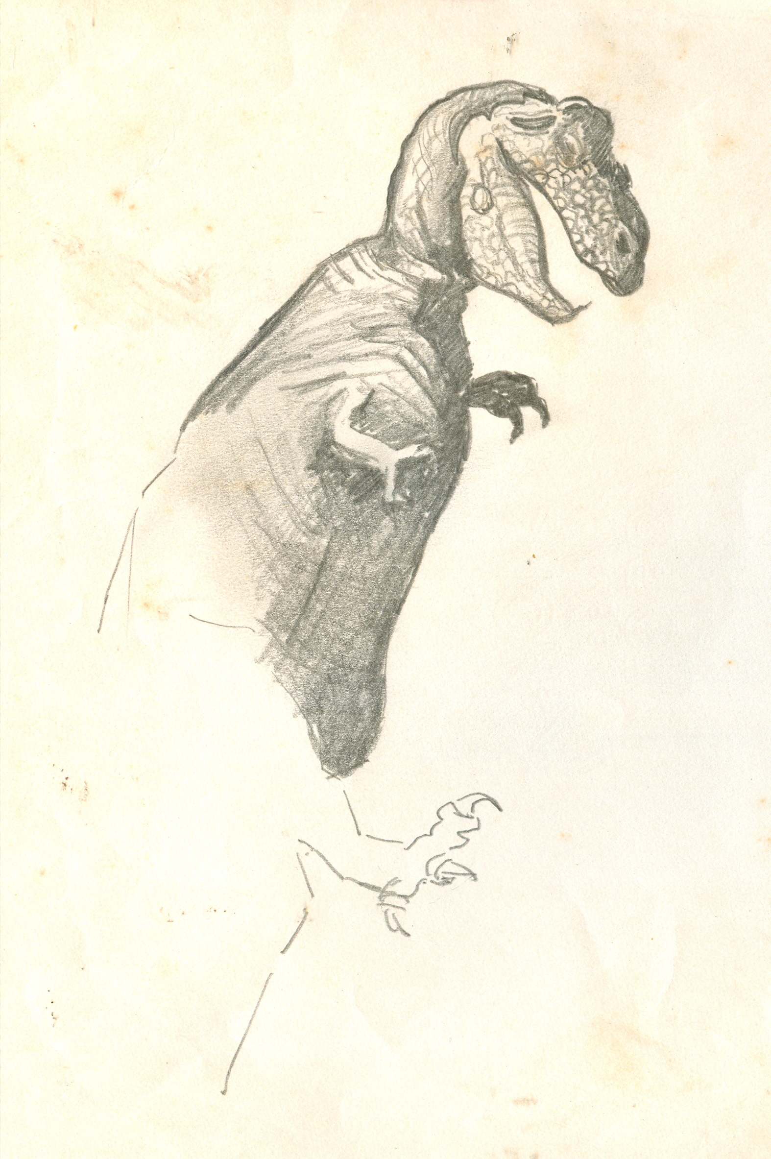 Below, a rough sketch of a Tyrannosaurus drawn by Larry Ivie on a moving train; and a Tyrannosaurus pencil drawing begun (but never completed) ca. 1956 by artist Victor Fabian, Sr.