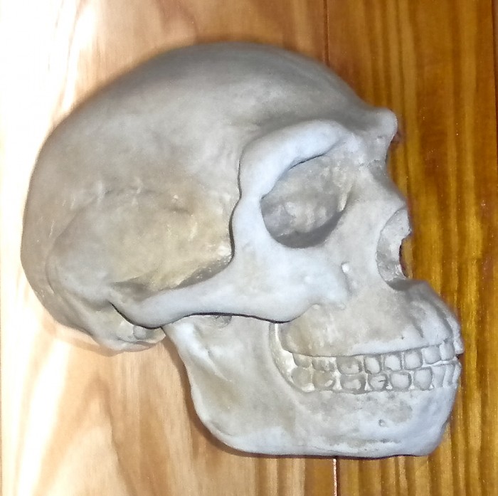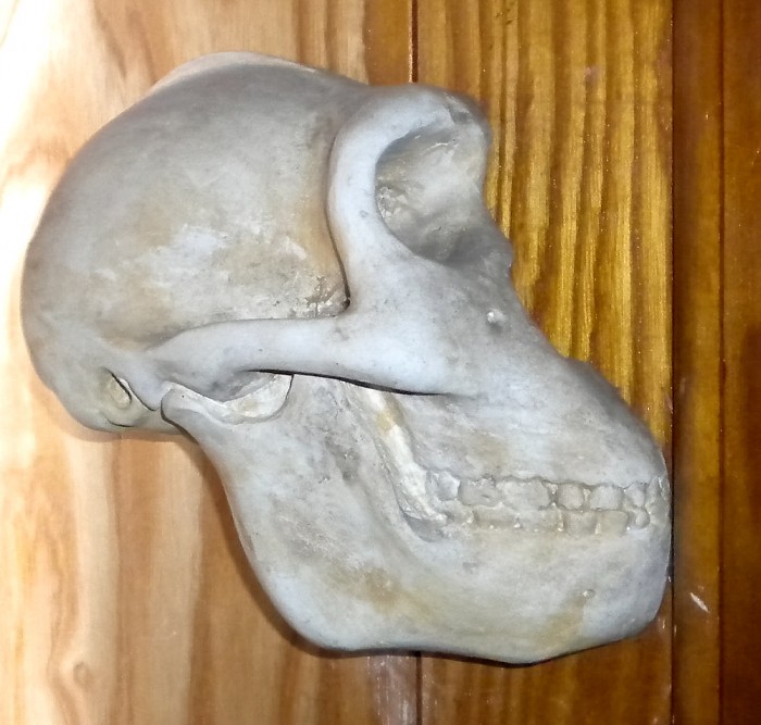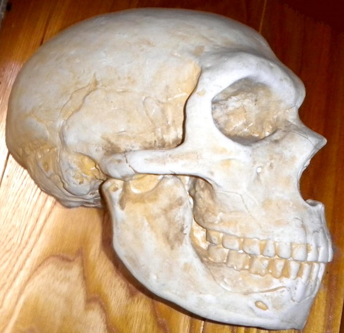 Skull plaster casts of some early ancestors. fom Jones Fossil Farm, Worthington, MN; also directly below, a reconstructed skull cast of the Australopithecus hominid nicknamed “Lucy” (Origin of Species Collection) from Design Toscano, Elk Grove Village, IL
