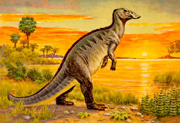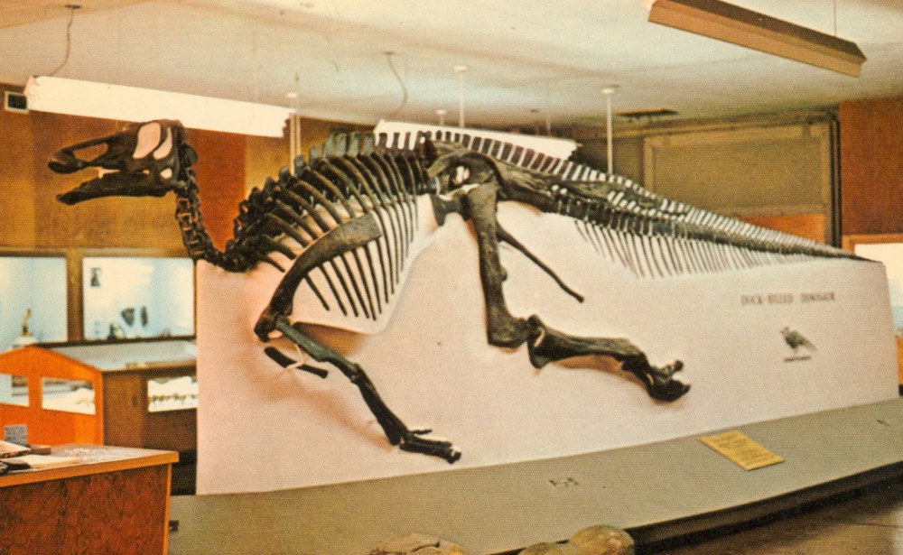 One of a series of “Dinosaur Postcards in Full Color” (1985), this one showing a painting by Matthew Kalmenoff of Edmontosaurus, based on a mural by Charles R. Knight painted for The Field Museum.